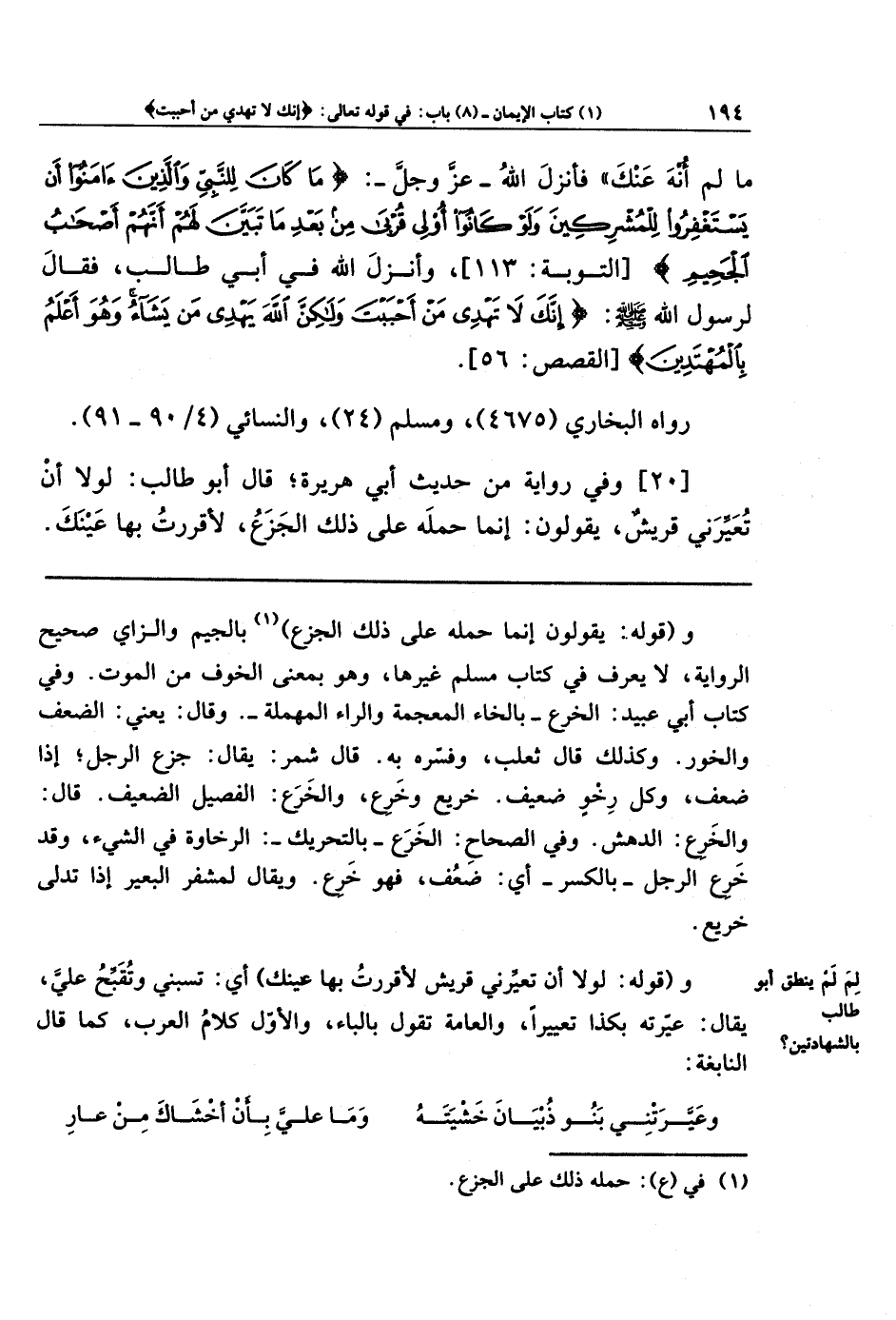[20] وَفِي رِوَايَةٍ مِن حَدِيثِ أَبِي هُرَيرَةَ: قَالَ أبو طَالِبٍ: لَولاَ أَن تُعَيِّرَنِي قُرَيشٌ؛ يَقُولُونَ: إِنَّمَا حَمَلَهُ عَلَى ذَلِكَ الجَزَعُ، لَأَقرَرتُ بِهَا عَينَكَ،