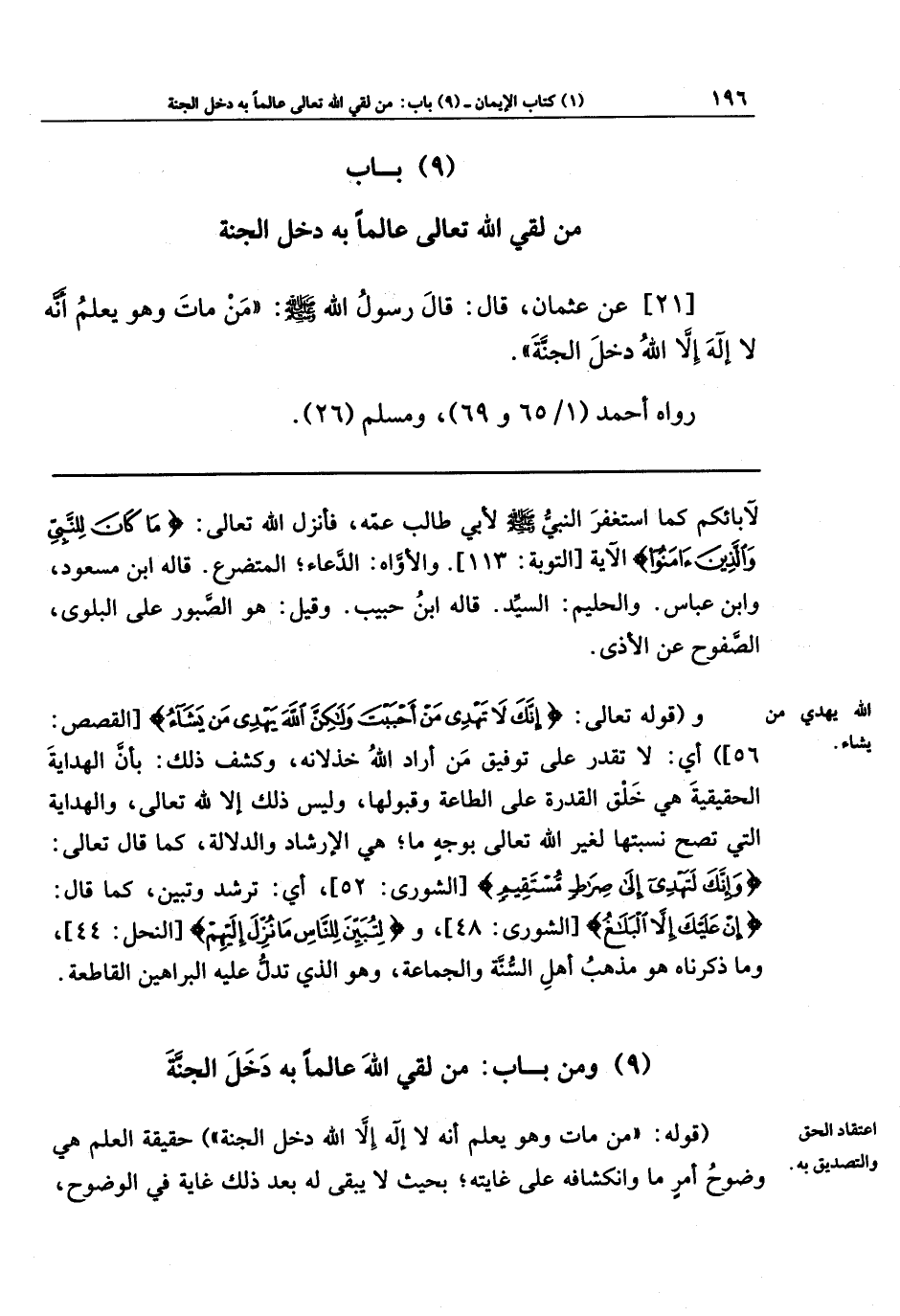 (9) وَمِن بَابِ مَن لَقِيَ اللهَ عَالِمًا بِهِ، دَخَلَ الجَنَّةَ
