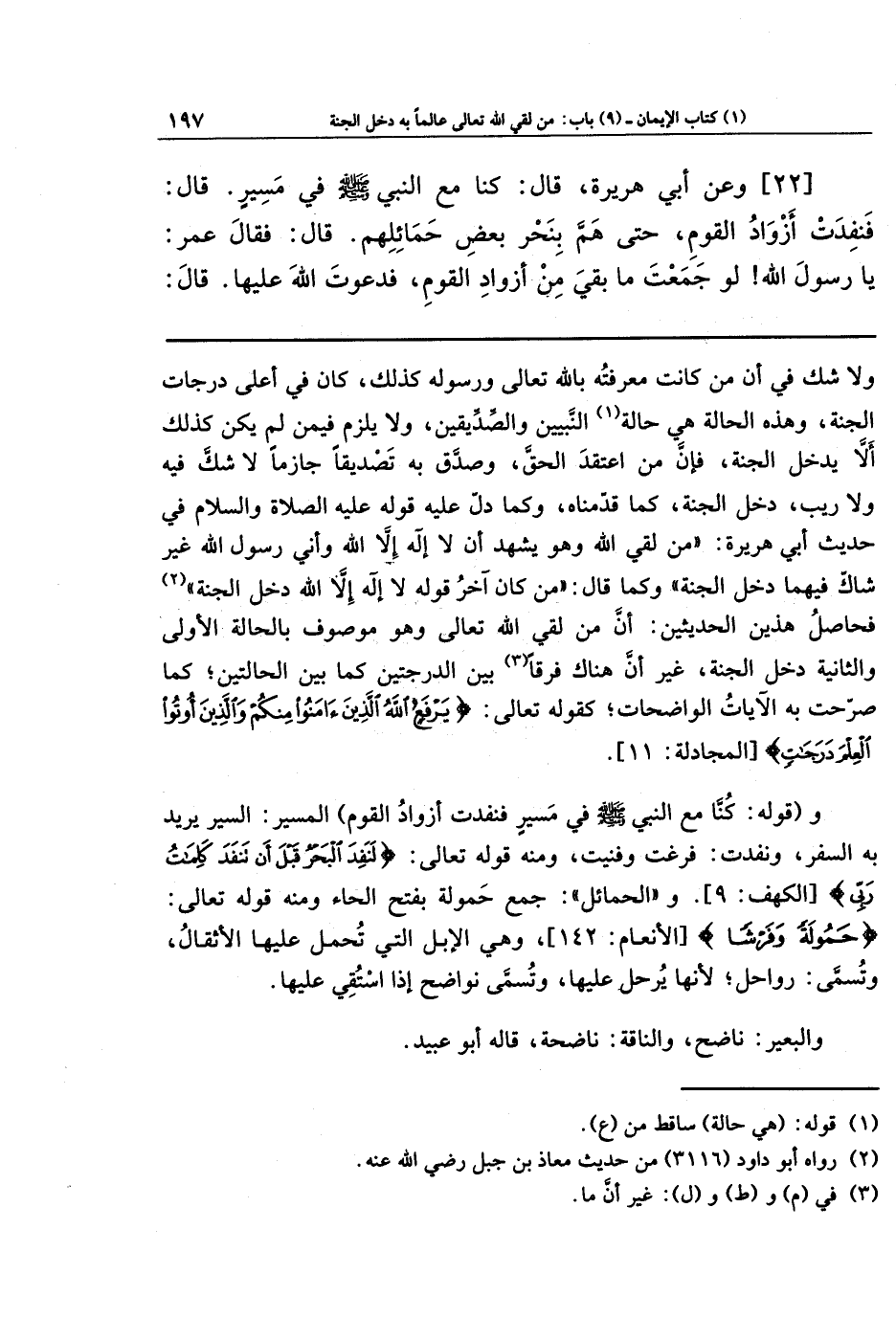 و(قوله: كُنَّا مَعَ النَّبِيِّ - صلى الله عليه وسلم - فِي مَسِيرٍ، فَنَفِدَت أَزوَادُ القَومِ) المسير: السيرُ، يريدُ به السفر، ونَفدَت: فَرَغَت وفَنِيَت؛ ومنه قولُهُ تعالى: لَنَفِدَ البَحرُ قَبلَ أَن تَنفَدَ كَلِمَاتُ رَبِّي.