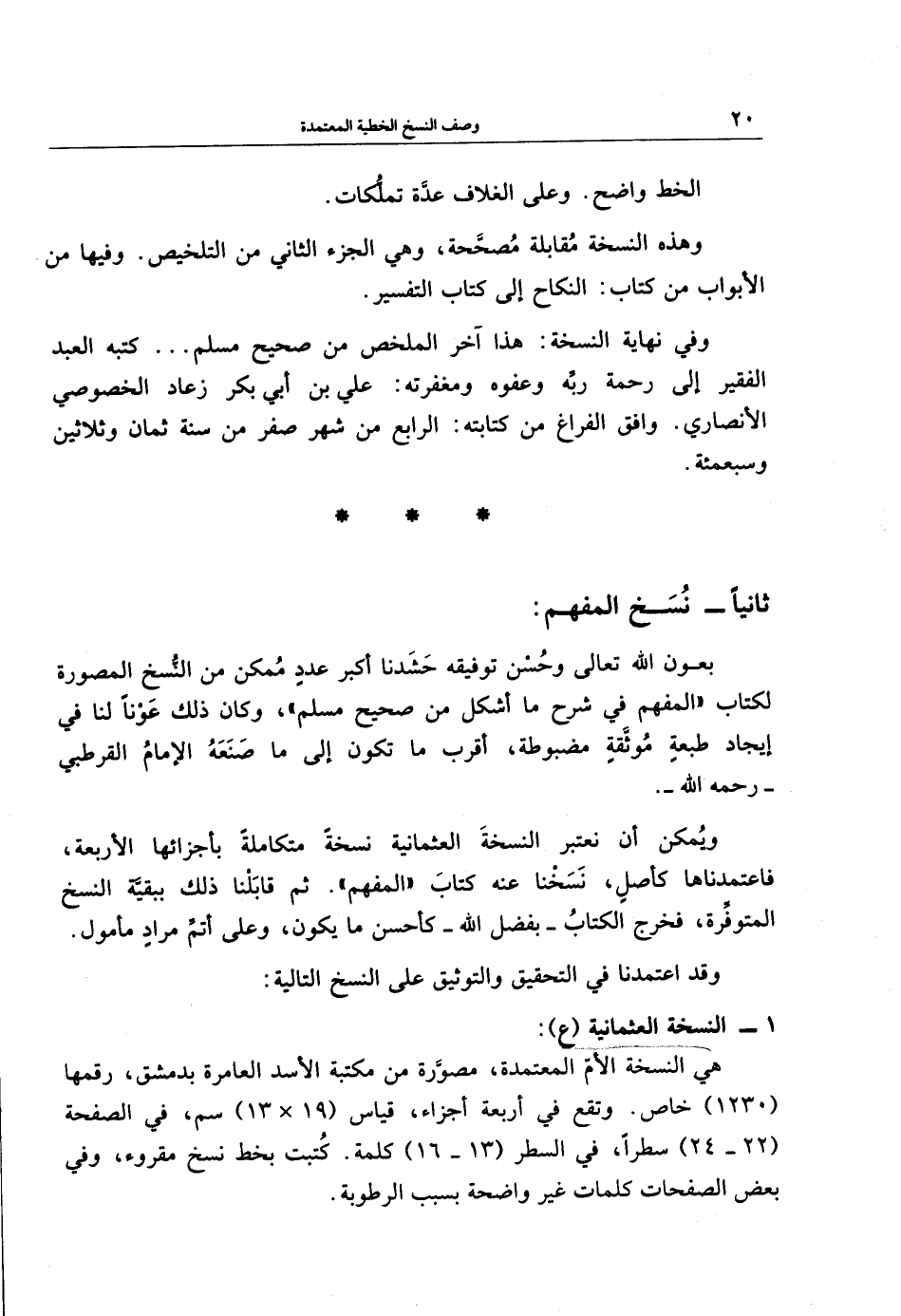 ويُمكن أن نعتبر النسخةَ العثمانية نسخةً متكاملة بأجزائها الأربعة، فاعتمدناها كأصلٍ، نَسَخْنا عنه كتابَ "المفهم". ثم قابَلْنا ذلك ببقيَّة النسخ المتوفرة، فخرج الكتابُ - بفضل الله - كأحسن ما يكون، وعلى أتمِّ مرادٍ مأمول.