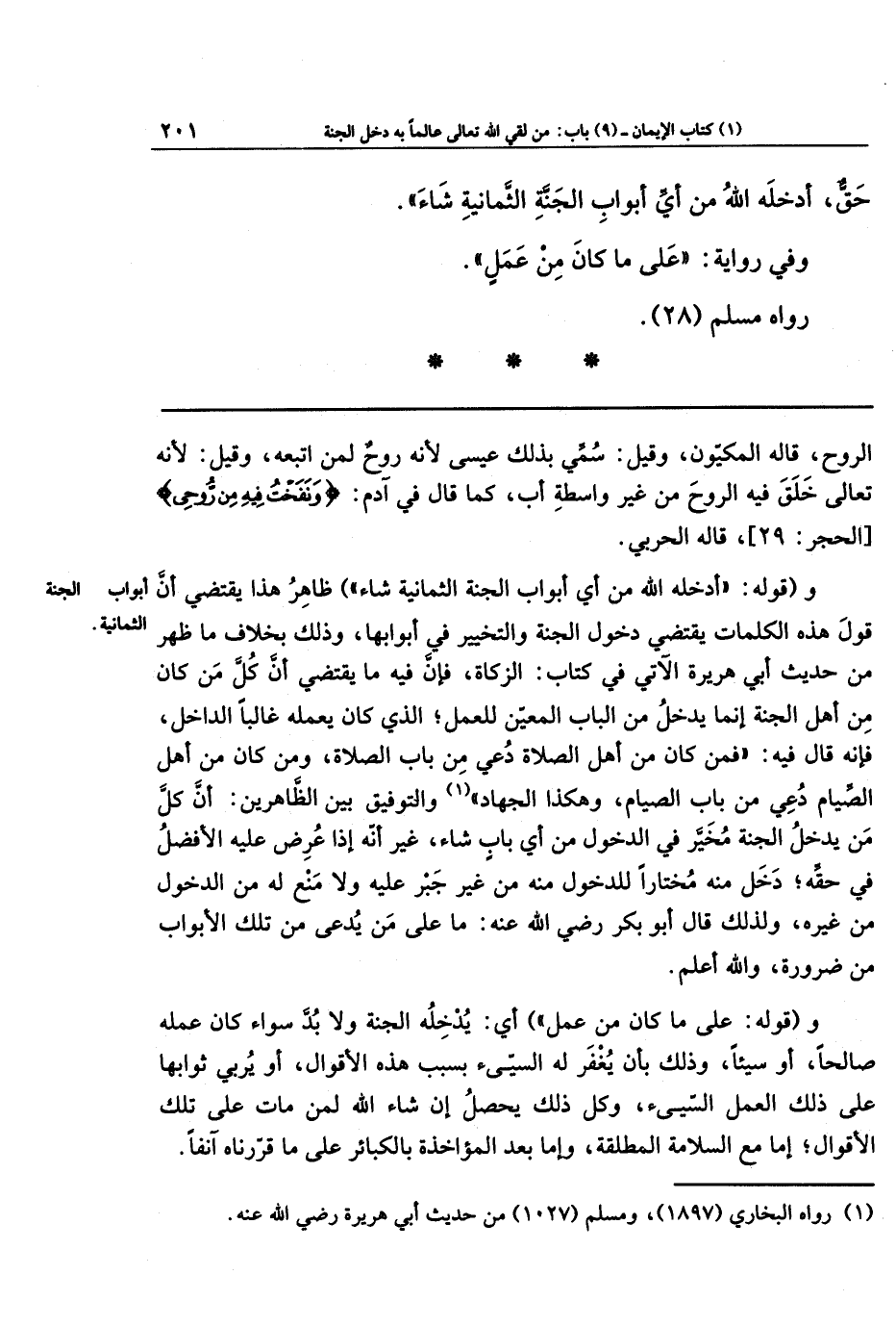 و(قوله: أَدخَلَهُ اللهُ مِن أَيِّ أَبوَابِ الجَنَّةِ الثَّمَانِيَةِ شَاءَ) ظاهر هذا يقتضي أنَّ قولَ هذه الكلماتِ يقتضي دخولَ الجنَّة، والتخييرَ في أبوابها، وذلك بخلافِ ما ظَهَر من حديث أبي هريرة الآتي في كتاب الزكاة؛ فإنَّ فيه ما يقتضي أنَّ كلَّ مَن كان مِن أهل الجنَّة إنما يدخُلُ من الباب المعيَّن للعمل الذي كان يعمله غالبًا الداخُل؛ فإنَّه قال فيه: فَمَن كَانَ مِن أهل الصَّلاَةِ، دُعِيَ مِن بَابِ الصَّلاَةِ، وَمَن كَانَ مِن أهل الصِّيَامِ، دُعِيَ مِن بَابِ الصِّيَامِ، وَهَكَذَا الجِهَادُ (¬1).