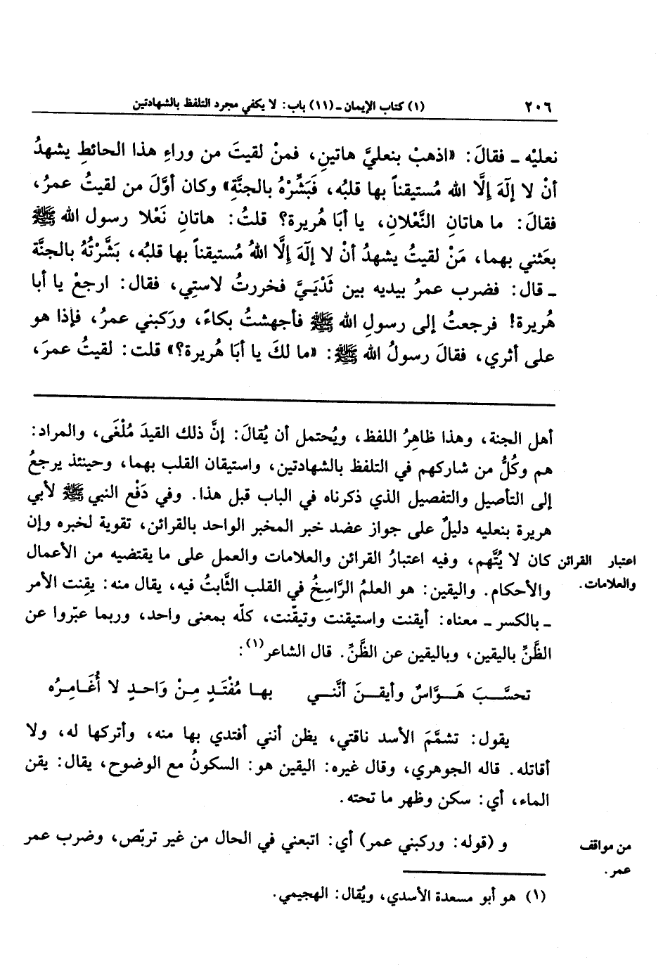 نَعلَيهِ - فقَالَ: اذهَب بِنَعلَيَّ هَاتَينِ، فَمَن لَقِيتَ مِن وَرَاءِ هَذَا الحَائِطِ يَشهَدُ أَن لاَ إِلهَ إِلاَّ اللهُ مُستَيقِنًا بِهَا قَلبُهُ، فَبَشِّرهُ بِالجَنَّةِ، وكَانَ أَوَّلَ مَن لَقِيتُ عُمَرُ، فَقَالَ: مَا هَاتَانِ النَّعلاَنِ يَا أَبَا هُرَيرَةَ؟ ! قُلتُ: هَاتَانِ نَعلاَ رَسُولِ الله - صلى الله عليه وسلم -، بَعَثَنِي بِهِمَا، مَن لَقِيتُ يَشهَدُ أَن لا إِلهَ إِلا اللهُ مُستَيقِنًا بِهَا قَلبُهُ، بَشَّرتُهُ بِالجَنَّةِ. قَالَ: فَضَرَبَ عُمَرُ بِيَدِيهِ بَينَ ثَديَيَّ، فَخَرَرتُ لاِستِي، فَقَالَ: ارجِع يَا أَبَا هُرَيرَةَ! فَرَجَعتُ إِلَى رَسُولِ الله - صلى الله عليه وسلم -، فَأَجهَشتُ بُكَاءً، وَرَكِبَنِي عُمَرُ، فَإِذَا هو عَلَى أَثَرِي، فَقَالَ رَسُولُ الله - صلى الله عليه وسلم -: مَا لَكَ يَا أَبَا هُرَيرَةَ؟ ! قُلتُ: لَقِيتُ عُمَرَ،