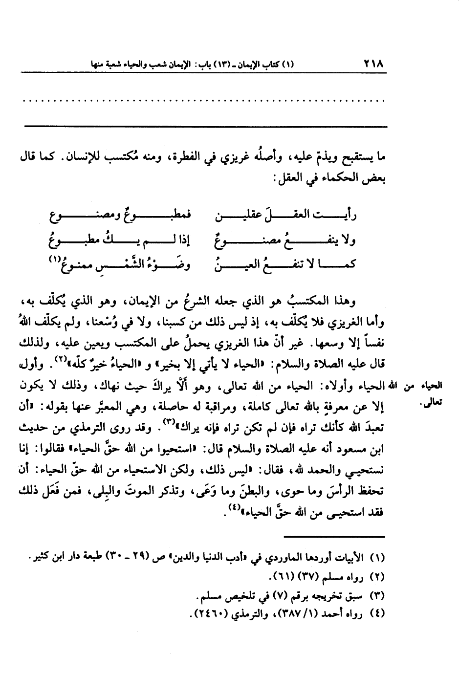 وأمَّا الغريزيُّ فلا يكلَّفُ به؛ إذ ليس ذلك مِن كسبنا، ولا في وُسعنا، ولم يكلِّفِ اللهُ نفسًا إلاَّ وسعها؛ غير أنَّ هذا الغريزيَّ يَحمِلُ على المكتسب، ويُعِينُ عليه؛ ولذلك قال عليه الصلاة والسلام: الحَيَاءُ لاَ يَأتِي إِلاَّ بِخَيرٍ، والحَيَاءُ خَيرٌ كُلُّهُ (¬2). وأوَّلُ الحياءِ وأَولاَه: الحياءُ من الله تعالى، وهو ألاَّ يراك حيثُ نهاك، وذلك لا يكونُ إلاَّ عن معرفةٍ بالله تعالى كاملة، ومراقبةٍ له حاصلَة، وهي المعبَّرُ عنها بقوله: أَن تَعبُدَ اللهَ كَأَنَّكَ تَرَاهُ؛ فَإِن لَم تَكُن تَرَاهُ فَإِنَّهُ يَرَاكَ (¬3).