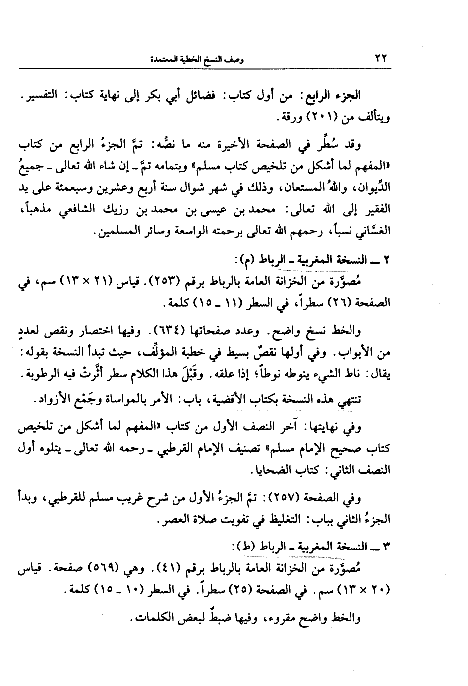 وفي نهايتها: آخر النصف الأول من كتاب "المفهم لما أشكل من تلخيص كتاب صحيح الإمام مسلم" تصنيف الإمام القرطبي - رحمه الله تعالى - يتلوه أول النصف الثاني: كتاب الضحايا.