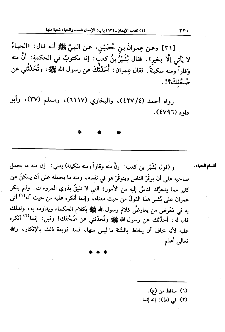 [31] وعَن عِمرَانَ بنِ حُصَينٍ، عَنِ النَّبِيِّ - صلى الله عليه وسلم - أَنَّهُ قَالَ: الحَيَاءُ لاَ يَأتِي إِلاَّ بِخَير، فَقَالَ بُشَيرُ بنُ كَعبٍ: إِنَّهُ مَكتُوبٌ فِي الحِكمَةِ: أَنَّ مِنهُ وَقَارًا، وَمِنهُ سَكِينَةً، فَقَالَ عِمرَانُ: أُحَدِّثُكَ عَن رَسُولِ الله - صلى الله عليه وسلم -، وَتُحَدِّثُنِي عَن صُحُفِكَ؟ !