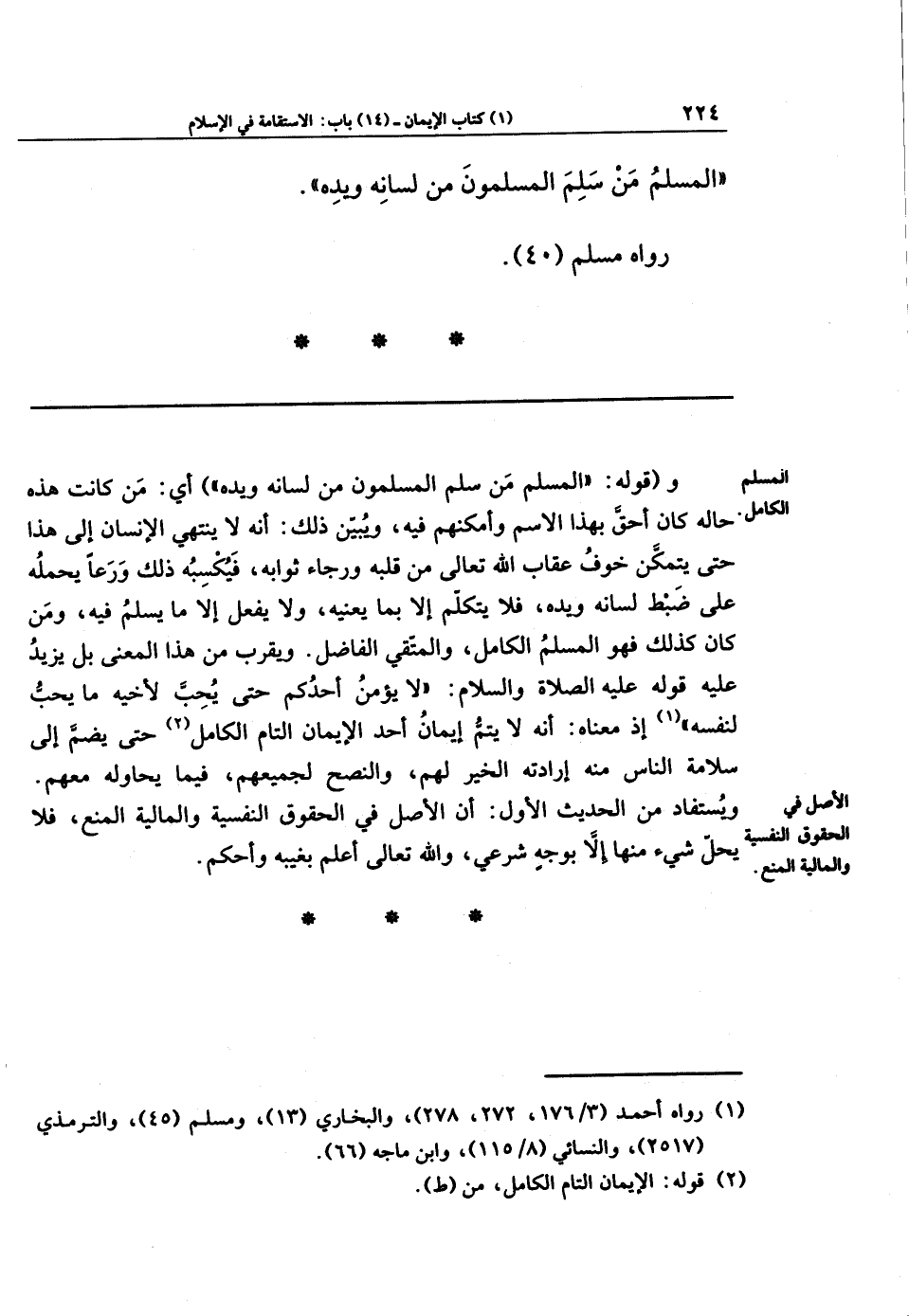 ويقرُبُ من هذا المعنى بل يزيدُ عليه: قولُهُ - عليه الصلاة والسلام -: لاَ يُؤمِنُ أَحَدُكُم حَتَّى يُحِبَّ لأخِيهِ مَا يُحِبُّ لِنَفسِهِ (¬1)؛ إذ معناه: أَنَّهُ لاَ يتمُّ إيمانُ أحدٍ الإيمانَ التامَّ الكامل (¬2)، حتَّى يَضُمَّ إلى سلامةَ النَّاسِ منه إرادته الخيرِ لهم، والنُّصحَ لجميعهم فيما يحاوله معهم. ويستفادُ من الحديث الأوَّل: أنَّ الأصلَ في الحقوقِ النفسيَّة والماليَّة المنعُ؛ فلا يحلُّ شيءٌ منها إلاَّ بوجهٍ شرعيٍّ، واللهُ تعالى أعلَمُ بغيبه وأحكم.