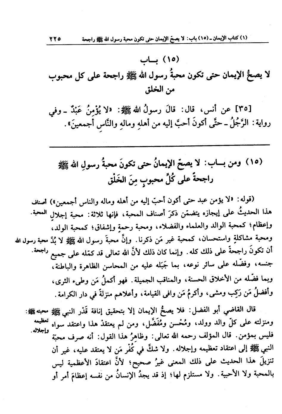 قال القاضي أبو الفضل: فلا يصحُّ الإيمانُ إلاَّ بتحقيق إنافةِ قَدرِ النبيِّ - صلى الله عليه وسلم - ومنزلتِهِ، على كلِّ والدٍ وولد، ومُحسِنٍ ومُفضِل، ومن لم يعتقد هذا واعتقَدَ سواه، فليس بمؤمنٍ. قال المؤلف رحمه الله تعالى: وظاهرُ هذا القول أنَّه صرَفَ محبَّةَ النبيِّ - صلى الله عليه وسلم - إلى اعتقادِ تعظيمِهِ وإجلاله، ولا شكَّ في كُفرِ مَن لا يعتقدُ عليه. غيرَ أنَّ تنزيلَ هذا الحديثِ على ذلك المعنى غيرُ صحيح؛ لأنَّ اعتقادَ الأعظَمِيَّةِ ليس بالمحبَّةِ، ولا الأحبِّيَّة، ولا مستَلزِم لها؛ إذ قد يجدُ الإنسانُ من نفسه إعظامَ أمرٍ أو