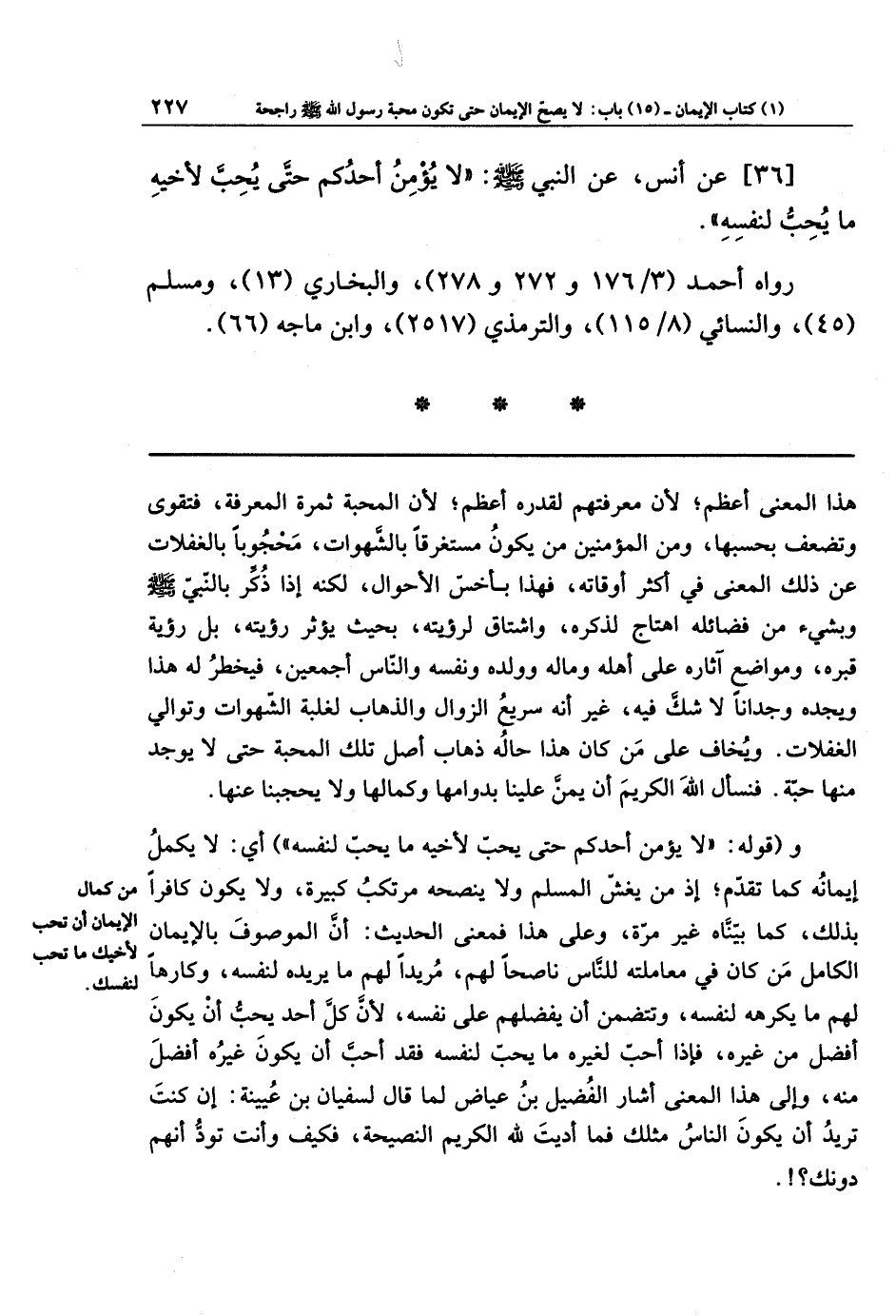 [36] عَن أَنَسٍ، عَنِ النَّبِيِّ - صلى الله عليه وسلم -: لاَ يُؤمِنُ أَحَدُكُم حَتَّى يُحِبَّ لِأخِيهِ مَا يُحِبُّ لِنَفسِهِ.