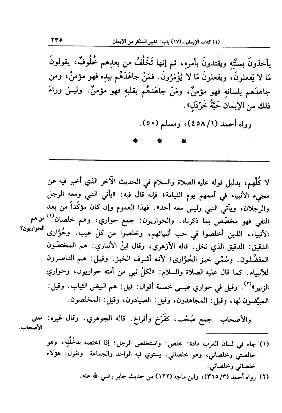يَأخُذُونَ بِسُنَّتِهِ، وَيَقتَدُونَ بِأَمرِهِ، ثُمَّ إِنَّهَا تَخلُفُ مِن بَعدِهِم خُلُوفٌ يَقُولُونَ مَا لاَ يَفعَلُونَ، وَيَفعَلُونَ مَا لاَ يُؤمَرُونَ؛ فَمَن جَاهَدَهُم بِيَدِهِ فهو مُؤمِنٌ، وَمَن جَاهَدَهُم بِلِسَانِهِ فهو مُؤمِنٌ، وَمَن جَاهَدَهُم بِقَلبِهِ فهو مُؤمِنٌ، ولَيسَ وَرَاءَ ذَلِكَ مِنَ الإِيمَانِ حَبَّةُ خَردَلٍ.