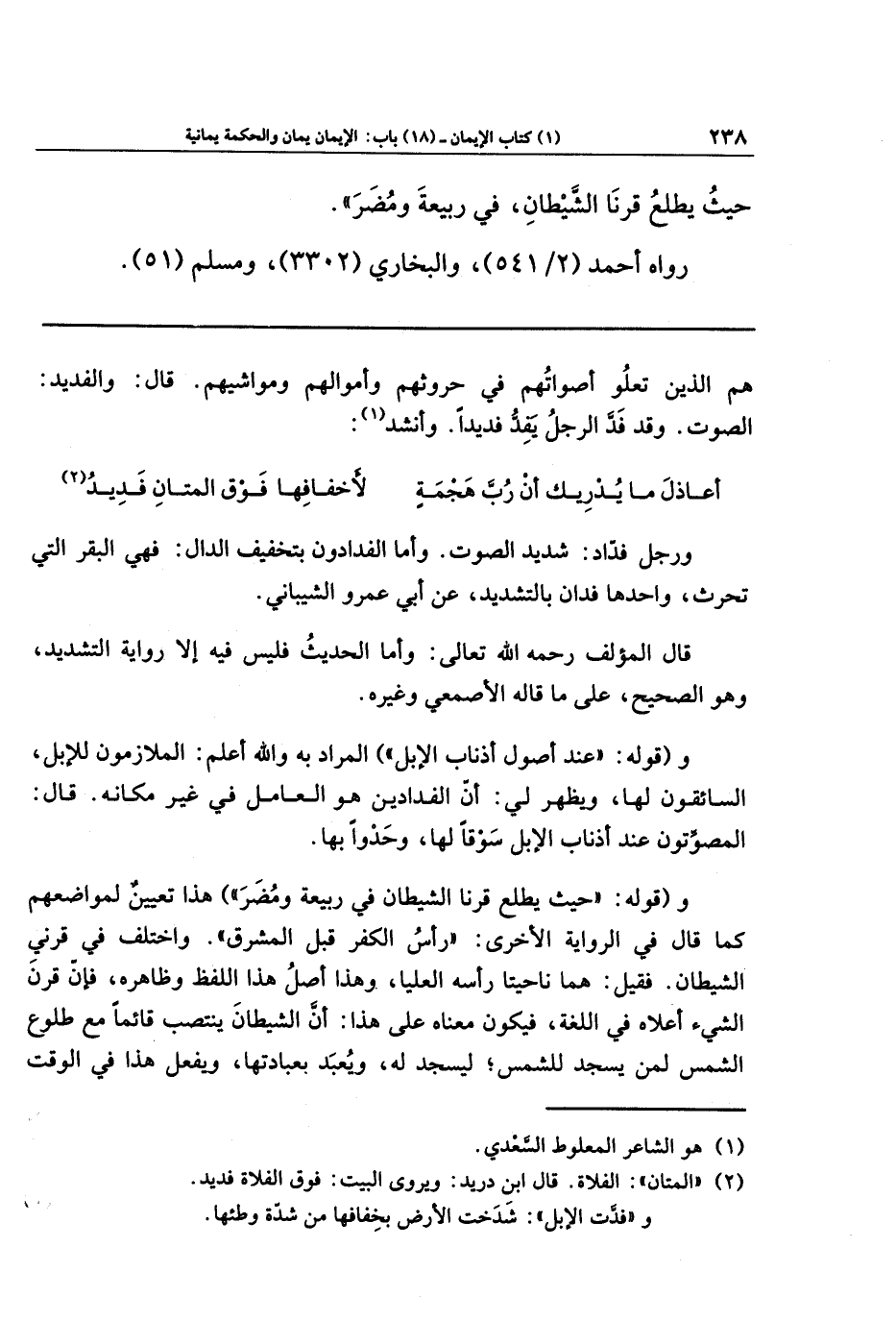 و(قوله: عِندَ أُصولِ أَذنَابِ الإِبِلِ) المراد به، والله أعلم: الملازمون للإبِلِ، السائقون لها. ويظهر لي: أنَّ الفَدَّادين هو العاملُ في غير مكانه. قال: المصوِّتون عند أذناب الإبِلِ سَوقًا لها، وحَدوًا بها.