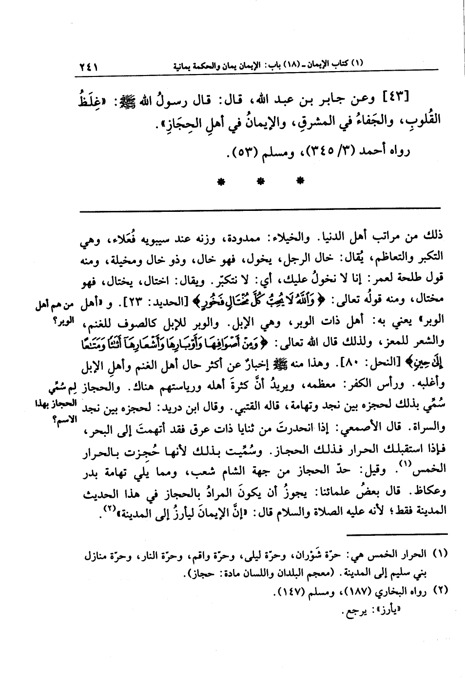 [43] وعَن جَابِرِ بنِ عَبدِ اللهِ، قَالَ: قَالَ رَسُولُ الله - صلى الله عليه وسلم -: غِلَظُ القُلُوبِ وَالجَفَاءُ فِي المَشرِقِ، وَالإِيمَانُ فِي أهل الحِجَازِ.