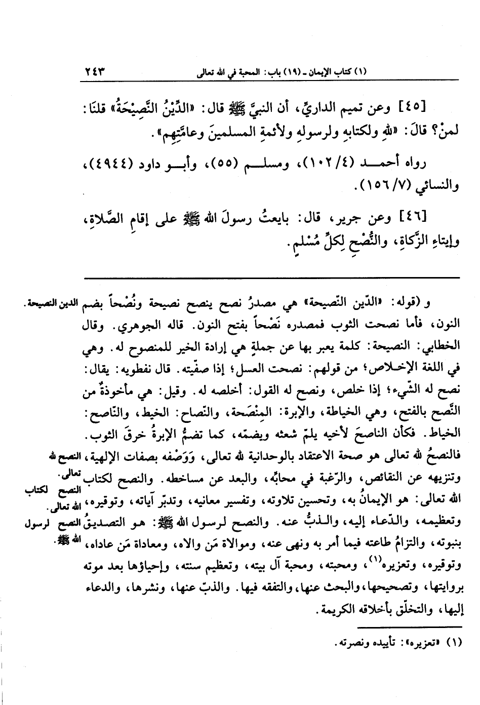 [45] وَعَن تَمِيمٍ الدَّارِيِّ؛ أَنَّ النَّبِيَّ - صلى الله عليه وسلم - قَالَ: الدِّينُ النَّصِيحَةُ، قُلنَا: لِمَن؟ قَال: للهِ، وَلِكِتَابِهِ، وَلِرَسُولِهِ، ولِأَئِمَّةِ المُسلِمِينَ وَعَامَّتِهِم.