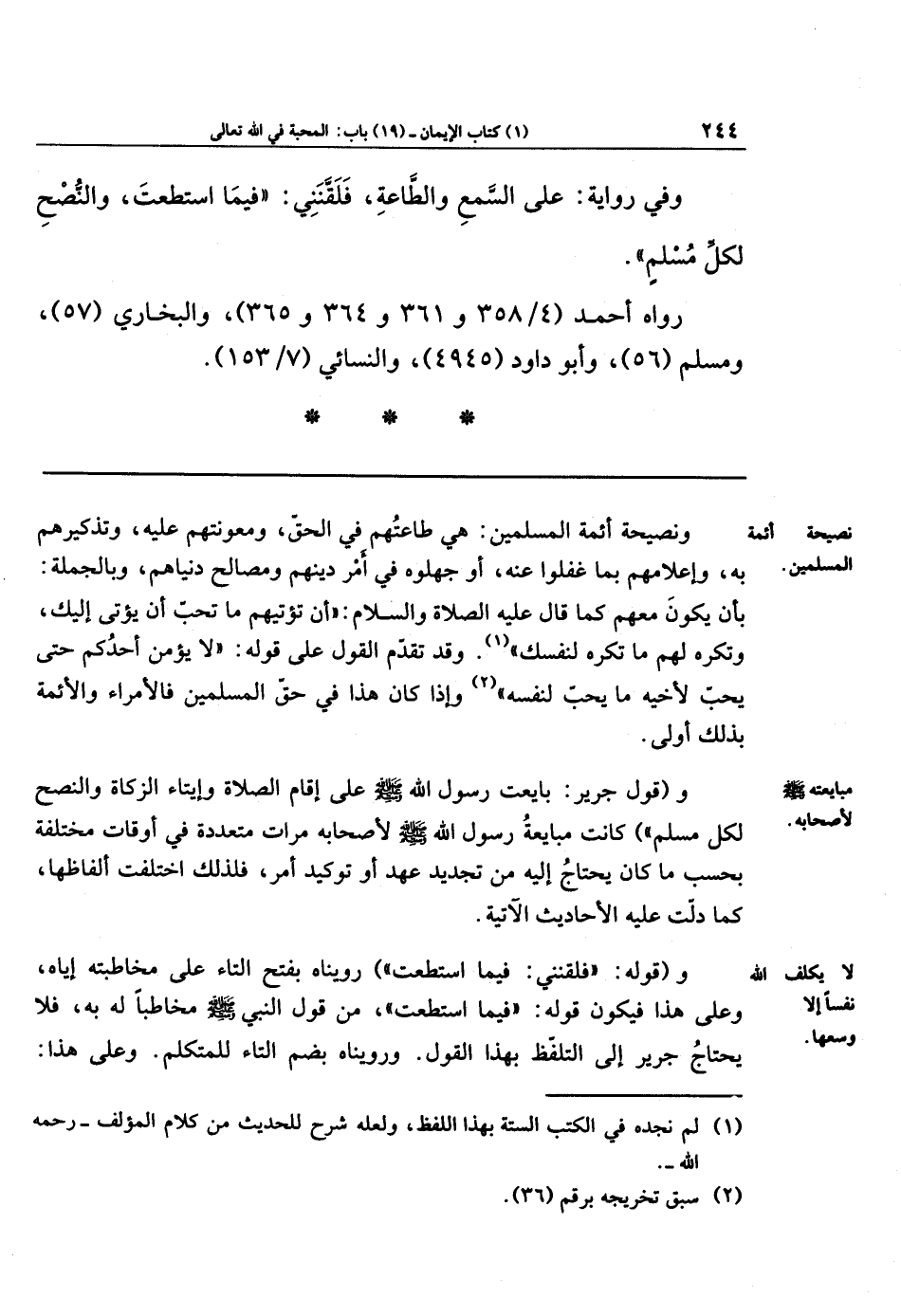 ونصيحةُ أئمَّةِ المسلمين: هي طاعتُهُم في الحقِّ، ومعونَتُهُم عليه، وتذكيرُهُم به، وإعلامُهُم بما غَفَلُوا عنه أو جهلوه في أمر دينهم ومصالح دنياهم، وبالجملة: بأَن يكونَ معهم كما قال - عليه الصلاة والسلام -: أن تُؤتِيَهُم مَا تُحِبُّ أن يُؤتَى إِلَيكَ، وتَكرَهَ لَهُم ما تَكرَهُ لِنَفسِكَ (¬1). وقد تقدَّم القولُ على قولِهِ: لاَ يُؤمِنُ أحدُكُم حَتَّى يُحِبَّ لِأَخِيهِ مَا يُحِبُّ لِنَفسِهِ (¬2). وإذا كان هذا في حَقِّ المسلمين، فالأمراءُ والأئمَّةُ بذلك أولى.