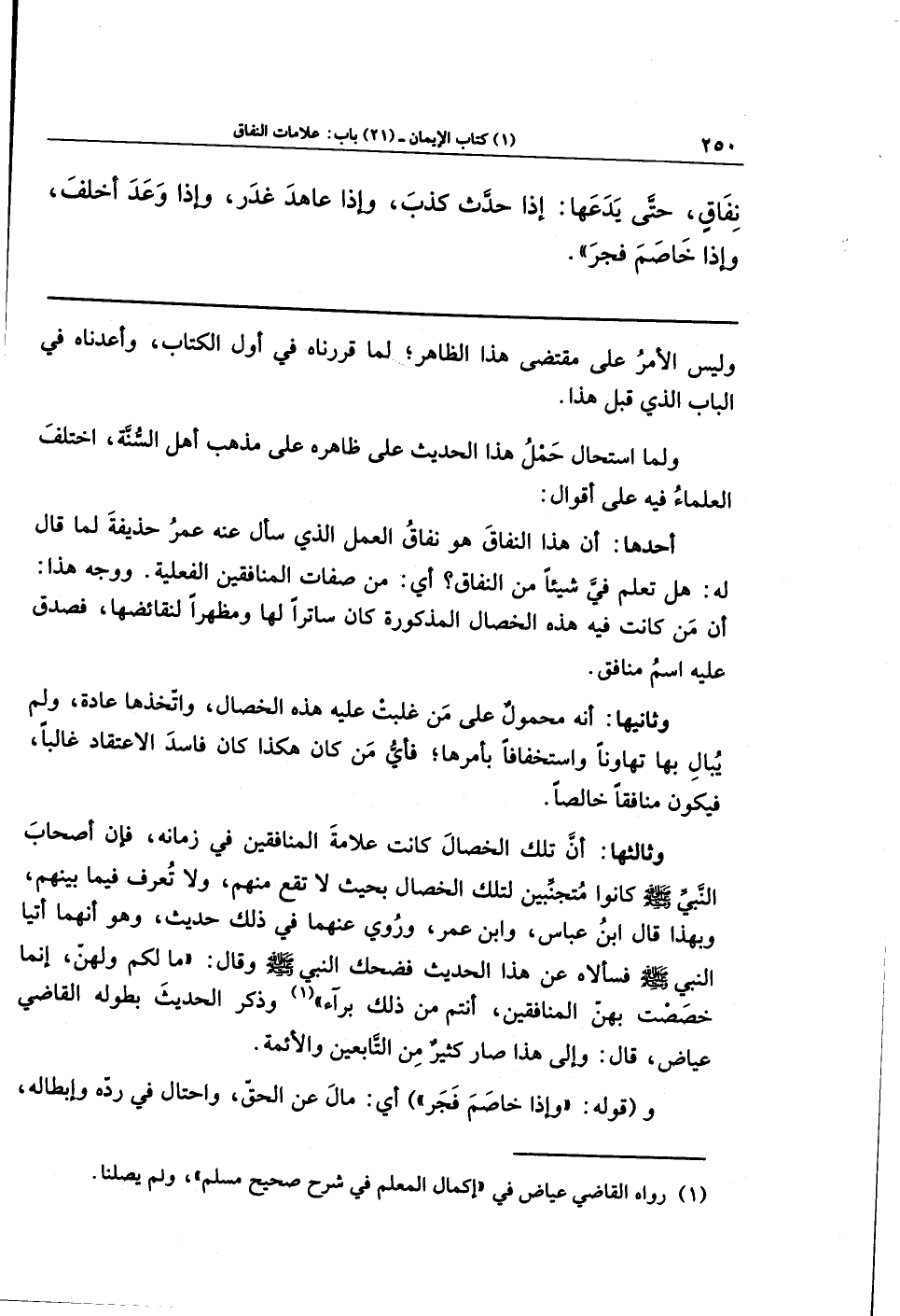 وثانيها: أنّه محمولٌ على مَن غلبت عليه هذه الخصال، واتَّخَذَها عادةً، ولم يبالِ بها؛ تهاوُنًا واستخفافًا بأمرها؛ فأي مَن كان هكذا، كان فاسدَ الاِعتقادِ غالبًا، فيكونُ منافقًا خالصًا.