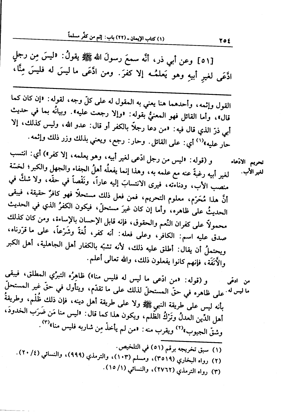[51] وَعَن أَبِي ذَرٍّ؛ أَنَّهُ سَمِعَ رسولَ الله - صلى الله عليه وسلم - يَقُولُ: لَيسَ مِن رَجُلٍ ادَّعَى لِغَيرِ أَبِيهِ - وهو يَعلَمُهُ - إِلاَّ كَفَرَ، وَمَنِ ادَّعَى مَا لَيسَ لَهُ، فَلَيسَ مِنَّا،