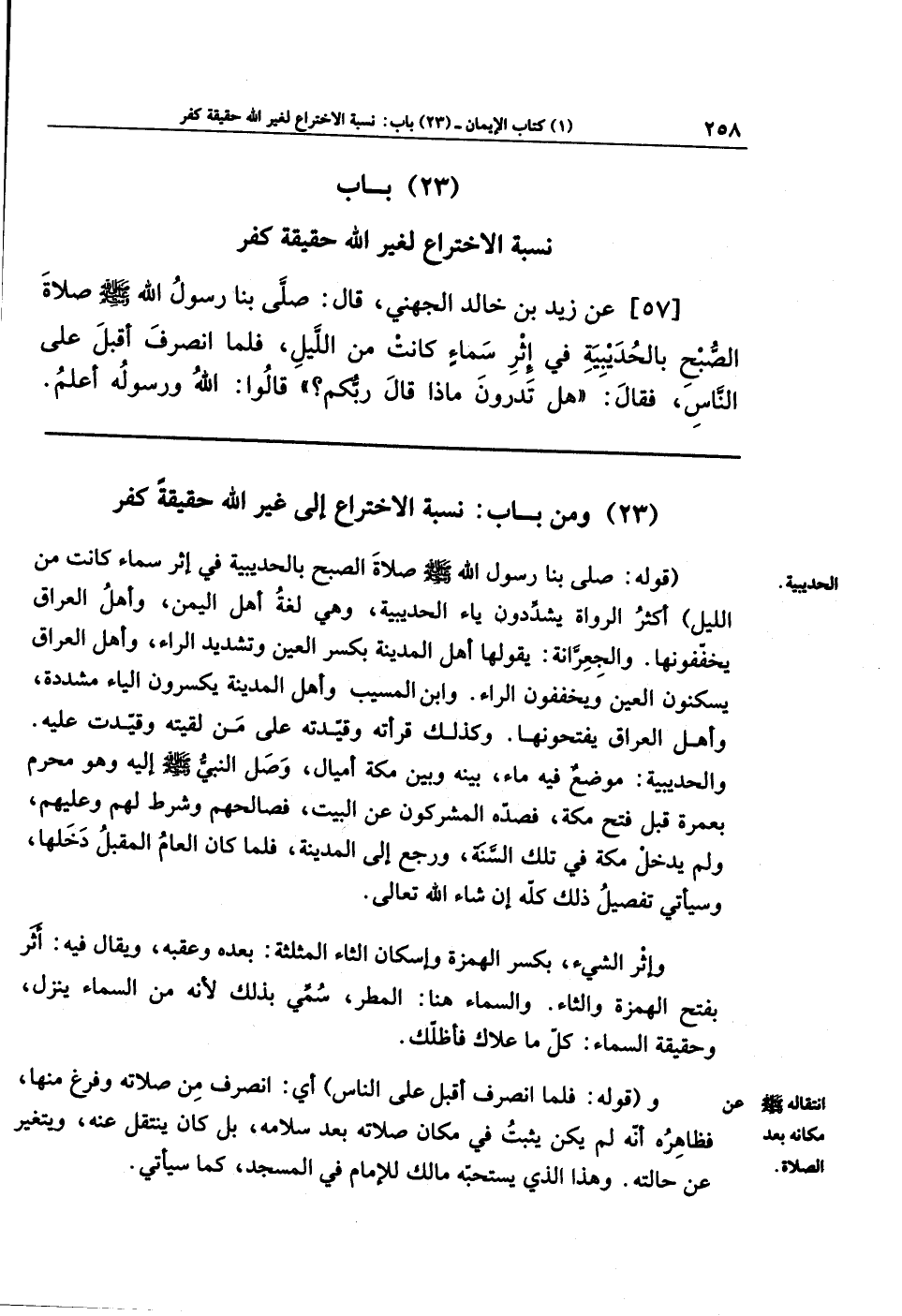 (قوله: صَلَّى بِنَا رَسُولُ اللهِ - صلى الله عليه وسلم - صَلاَةَ الصُّبحِ بِالحُدَيبِيَةِ فِي إِثرِ سَمَاءٍ كَانَت مِنَ اللَّيلِ) أكثرُ الرواة يشدِّدون ياء الحُدَيبِيَّةِ، وهي لغةُ أهلُ اليمن، وأهل العراق يخفِّفونها. والجِعِرَّانة يقولها أهلُ المدينة بكسر العين وتشديد الراء، وأهلُ العراق يُسكِنون العين ويُخفِّفون الراء، وابنُ المسيِّب وأهلُ المدينة يكسرون الياءَ مشدَّدة، وأهلُ العراق يفتحونها، وكذلك قرأتُهُ، وقيَّدته على مَن لَقِيته وقَيَّدتُّ عليه.
