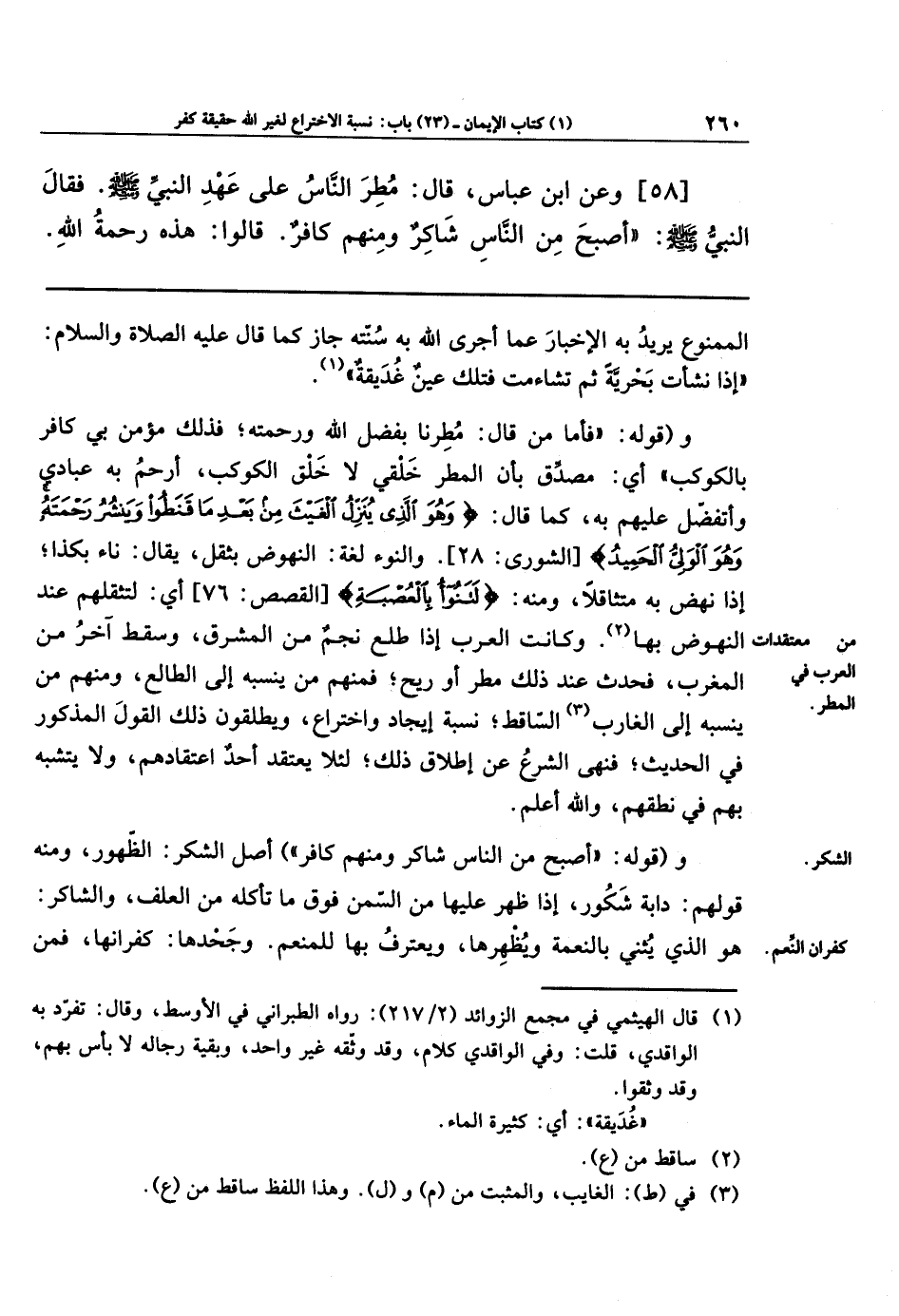 [58] وَعَنِ ابنِ عَبَّاسٍ، قَالَ: مُطِرَ النَّاسُ عَلَى عَهدِ النَّبِيِّ - صلى الله عليه وسلم -، فَقَالَ النَّبِيُّ - صلى الله عليه وسلم -: أَصبَحَ مِنَ النَّاسِ شَاكِرٌ، وَمِنهُم كَافِرٌ، قَالُوا: هَذِهِ رَحمَةُ اللهِ،