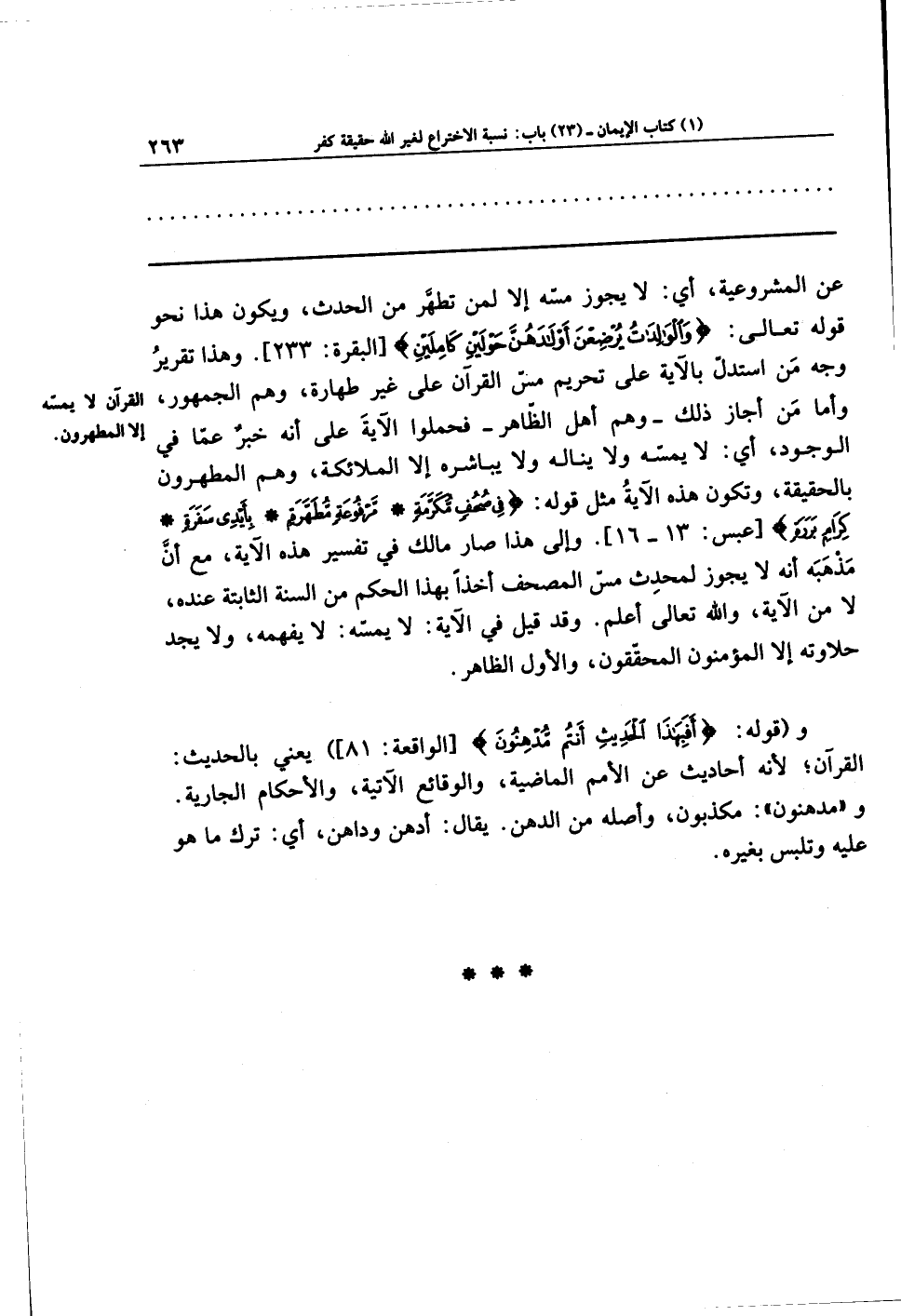 عن المشروعيَّة، أي: لا يجوزُ مسُّهُ إلاَّ لمن تطهَّر من الحدث، ويكونُ هذا نحو قولِهِ تعالى: وَالوَالِدَاتُ يُرضِعنَ أَولَادَهُنَّ حَولَينِ كَامِلَينِ. وهذا تقريرُ وجهِ منِ استدلَّ بالآية على تحريمِ مَسِّ القرآنِ على غير طهارة، وهُمُ الجمهور، وأَمَّا مَن أجاز ذلك، وهم أهلُ الظاهر: فحملوا الآية على أنَّها خبرٌ عمَّا في الوجود، أي: لا يَمَسُّهُ ولا ينالُهُ ولا يباشرُهُ إلا الملائكةُ، وهم المطهَّرون بالحقيقةِ، وتكونُ هذه الآيةُ مثلَ قوله: {فِي صُحُفٍ مُكَرَّمَةٍ * مَرفُوعَةٍ مُطَهَّرَةٍ * بِأَيدِي سَفَرَةٍ * كِرَامٍ بَرَرَةٍ}؛ وإلى هذا صار مالكٌ في تفسير هذه الآية، مع أنَّ مذهبَهُ أنَّه لا يجوزُ لِمُحدِثٍ مسُّ المصحف؛ أخذًا بهذا الحكم مِنَ السُّنَّةِ الثابتة عنده، لا مِنَ الآية، والله تعالى أعلم. وقد قيل في الآية: لَا يَمَسُّهُ: لا يفهمُهُ ولا يجدُ حلاوتَهُ إلا المؤمنون المحقِّقون، والأول الظاهر.