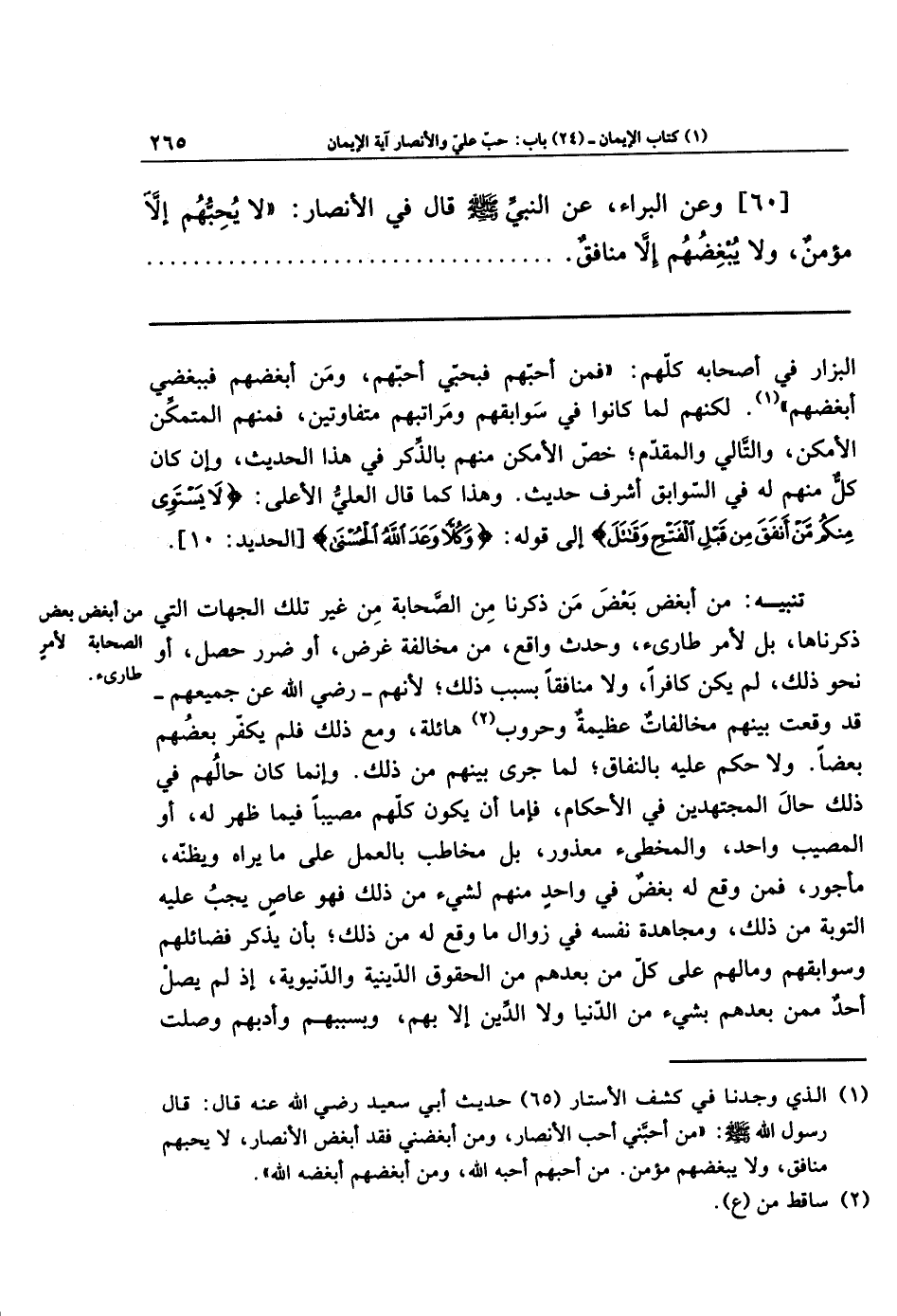 [60] وعَنِ البَرَاءِ، عَنِ النَّبِيِّ - صلى الله عليه وسلم - قَالَ فِي الأَنصَارِ: لاَ يُحِبُّهُم إِلاَّ مُؤمِنٌ، وَلاَ يُبغِضُهُم إِلاَّ مُنَافِقٌ؛