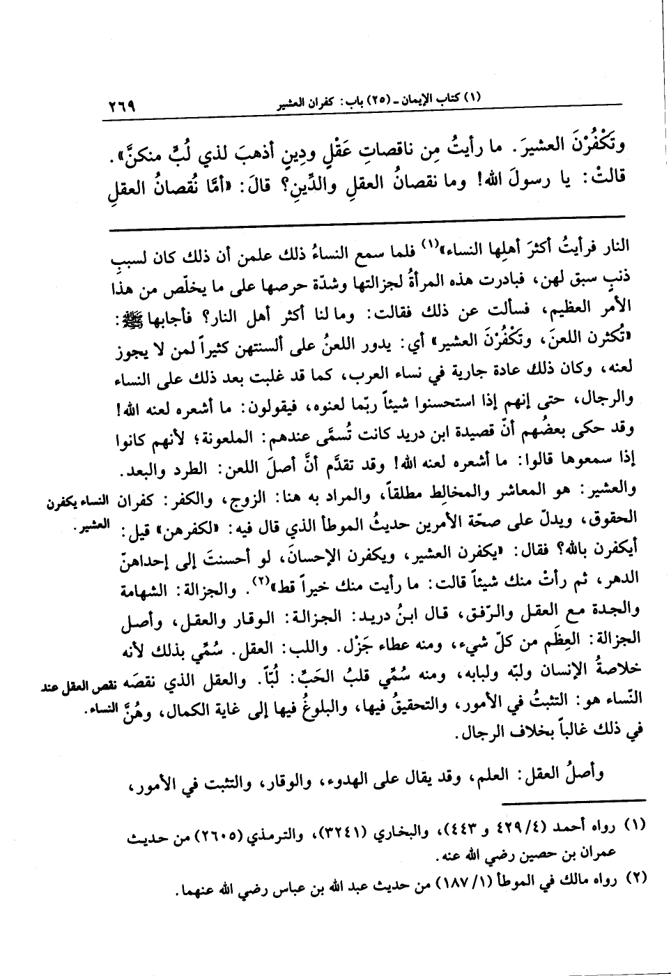 وَتَكفُرنَ العَشِيرَ، مَا رَأَيتُ مِن نَاقِصَاتِ عَقلٍ وَدِينٍ أَذهَبَ لِذِي لُبٍّ مِنكُنَّ! قَالَت: يَا رسولَ الله وَمَا نُقصَانُ العَقلِ وَالدِّينِ؟ قَالَ: أَمَّا نُقصَانُ العَقلِ: