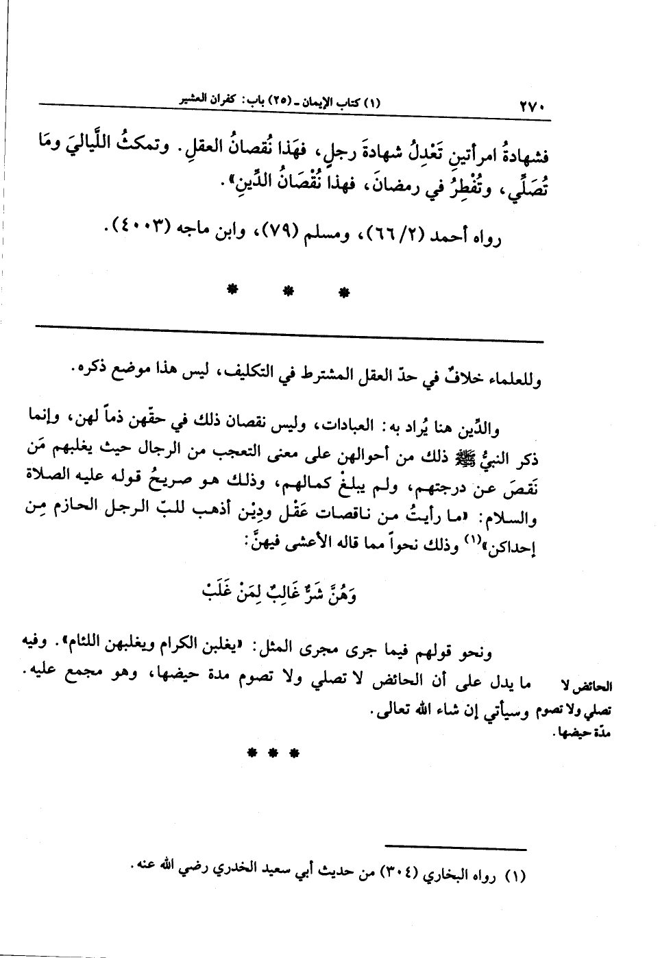 فَشَهَادَةُ امرَأَتَينِ تَعدِلُ شَهَادَةَ رَجُلٍ؛ فَهَذَا نُقصَانُ العَقلِ، وَتَمكُثُ اللَّيَالِيَ وَمَا تُصَلِّي، وَتُفطِرُ فِي رَمَضَانَ؛ فَهَذَا نُقصَانُ الدِّينِ.