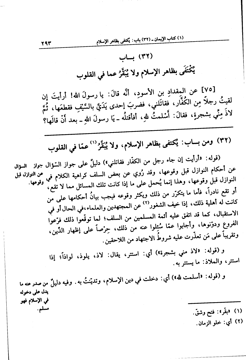 (32) وَمِن بَابٍ يُكتَفَى بِظَاهِرِ الإِسلاَمِ، وَلاَ يُبقَّرُ (¬1) عَمَّا فِي القُلُوبِ