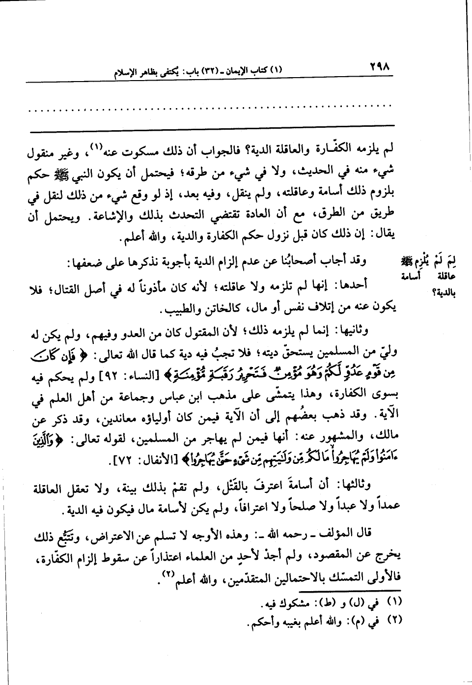 لم يُلزِمهُ الكَفَّارةَ، والعاقلةَ الديةَ؟ فالجوابُ: أنَّ ذلك مسكوتٌ عنه (¬1)، وغيرُ منقولٍ شيءٌ منه في الحديث ولا في شيءٍ من طرقه؛ فيَحتَمِلُ أن يكونَ النبي - صلى الله عليه وسلم - حكَمَ بلزومِ ذلك أسامةَ وعاقلتِهِ ولم يُنقَل، وفيه بعد؛ إذ لو وقَعَ شيءٌ من ذلك، لَنُقِلَ في طريقٍ من الطرق، مع أنَّ العادة تقتضي التحدُّثَ بذلك والإشاعةَ. وَيَحتملُ أن يقال: إنَّ ذلك كان قبل نزولِ حُكمِ الكفَّارة والدية، والله أعلم.