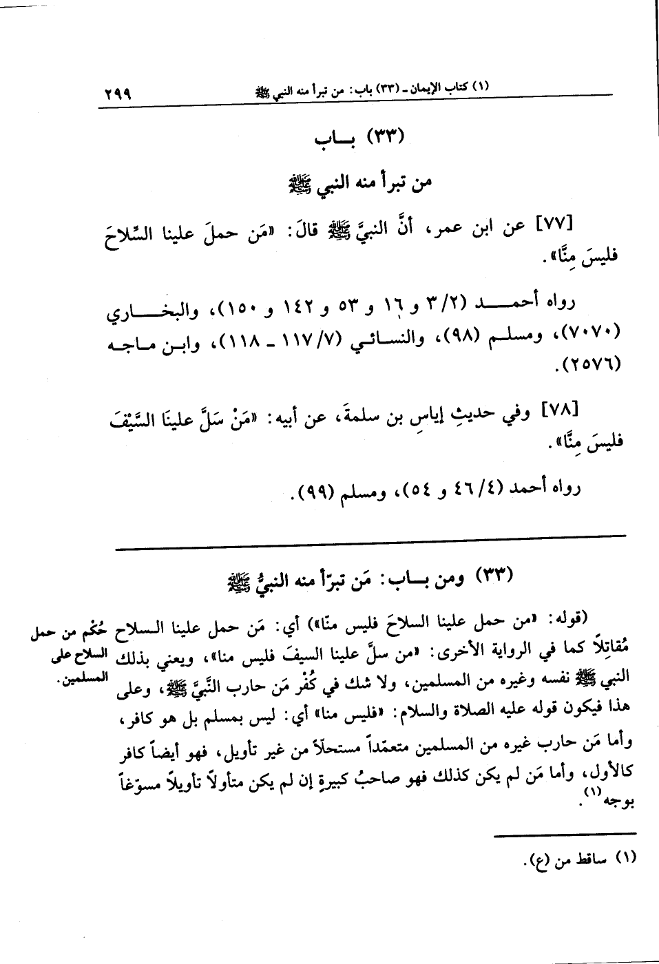 [77] عَنِ ابنِ عُمَرَ؛ أَنَّ النَّبِيَّ - صلى الله عليه وسلم - قَالَ: مَن حَمَلَ عَلَينَا السِّلاَحَ فَلَيسَ مِنَّا.