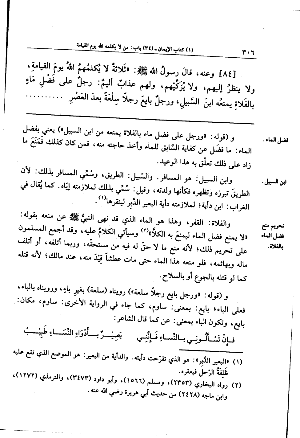 [84] وَعَنهُ، قَالَ رَسُولُ اللهِ - صلى الله عليه وسلم -: ثَلاَثَةٌ لاَ يُكَلِّمُهُمُ اللهُ يَومَ القِيَامَةِ، وَلاَ يَنظُرُ إِلَيهِم، وَلاَ يُزَكِّيهِم، وَلَهُم عَذَابٌ أَلِيمٌ: رَجُلٌ عَلَى فَضلِ مَاءٍ بِالفَلاَةِ يَمنَعُهُ ابنِ السَّبِيلِ، وَرَجُلٌ بَايَعَ رَجُلاً سِلعَةً بَعدَ العَصرِ