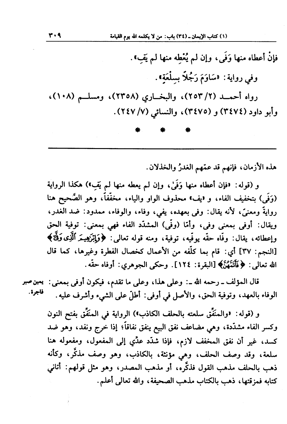 و(قوله: والمُنَفِّقُ سِلعَتَهُ بِالحَلِفِ الكَاذِب) الروايةُ في المُنَفِّق: بفتح النون وكسر الفاء مشدَّدة، وهي مضاعَفُ: نَفَقَ البِيعُ يَنفُقُ نَفَاقًا: إذا خرَجَ ونفَدَ، وهو ضدُّ كَسَدَ، غيرَ أنَّ نَفَقَ المخفَّفَ لازمٌ، فإذا شُدِّد، عُدِّي إلى المفعول، ومفعولُهُ هنا سِلعة. وقد وصَفَ الحَلِف وهي مؤنَّثة، بالكاذب وهو وصفُ مذكَّرٍ، وكأنَّه ذهب بالحلفِ مذهبَ القَول فذكَّره، أو مذهَبَ المصدر، وهو مِثلُ قولهم: أتاني كِتَابُهُ فَمَزَّقتُهَا؛ ذهب بالكتابِ مذهَبَ الصَّحِيفة، والله تعالى أعلم.