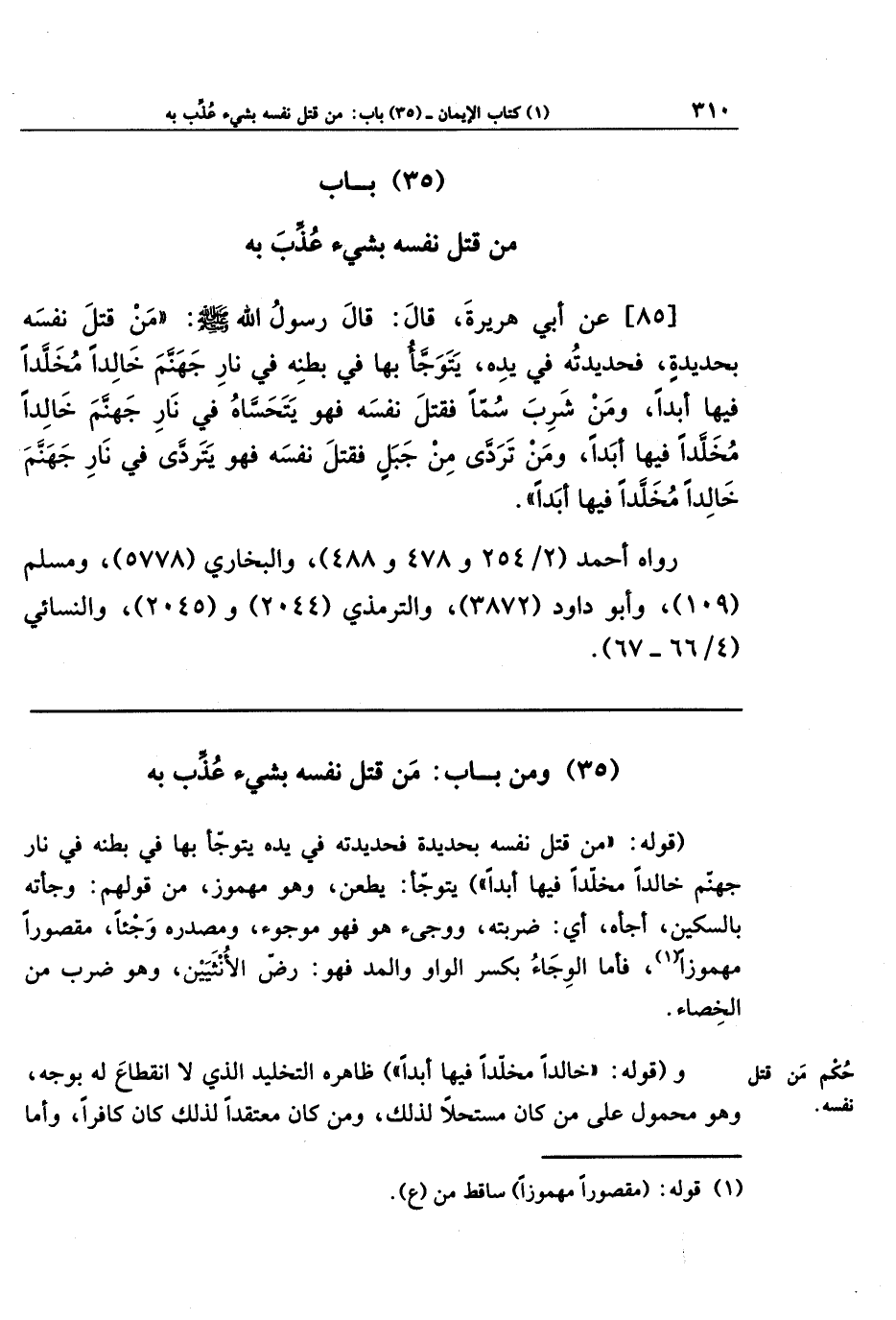 [85] عَن أَبِي هُرَيرَةَ، قَالَ: قَالَ رَسُولُ اللهِ - صلى الله عليه وسلم -: مَن قَتَلَ نَفسَهُ بِحَدِيدَةٍ، فَحَدِيدَتُهُ فِي يَدِهِ، يَتَوَجَّأُ بِهَا فِي بَطنِهِ فِي نَارِ جَهَنَّمَ خَالِدًا مُخَلَّدًا فِيهَا أَبَدًا، وَمَن شَرِبَ سُمًّا فَقَتَلَ نَفسَهُ، فهو يَتَحَسَّاهُ فِي نَارِ جَهَنَّمَ خَالِدًا مُخَلَّدًا فِيهَا أَبَدًا، وَمَن تَرَدَّى مِن جَبَلٍ فَقَتَلَ نَفسَهُ، فهو يَتَرَدَّى فِي نَارِ جَهَنَّمَ خَالِدًا مُخَلَّدًا فِيهَا أَبَدًا.