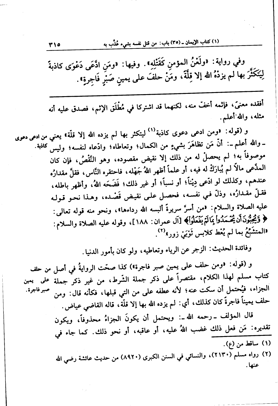 و(قوله: وَمَن حَلَفَ عَلَى يَمِينٍ صَبرٍ فَاجِرَةٍ) كذا صحَّتِ الروايةُ في أصلِ كتابِ مسلم لهذا الكلام، مقتصرًا على ذكر جملة الشرط مِن غير ذكرِ جملةِ الجزاء؛ فَيَحتمِلُ: أن سكَتَ عنه؛ لأنَّه عطفَهُ على مَن التي قبلها، فكأنَّه قال: ومن حلف يمينًا فاجرة، كان كذلك، أي: لم يَزِدهُ اللهُ بها إلاَّ قِلَّةً؛ قاله القاضي عِيَاض.