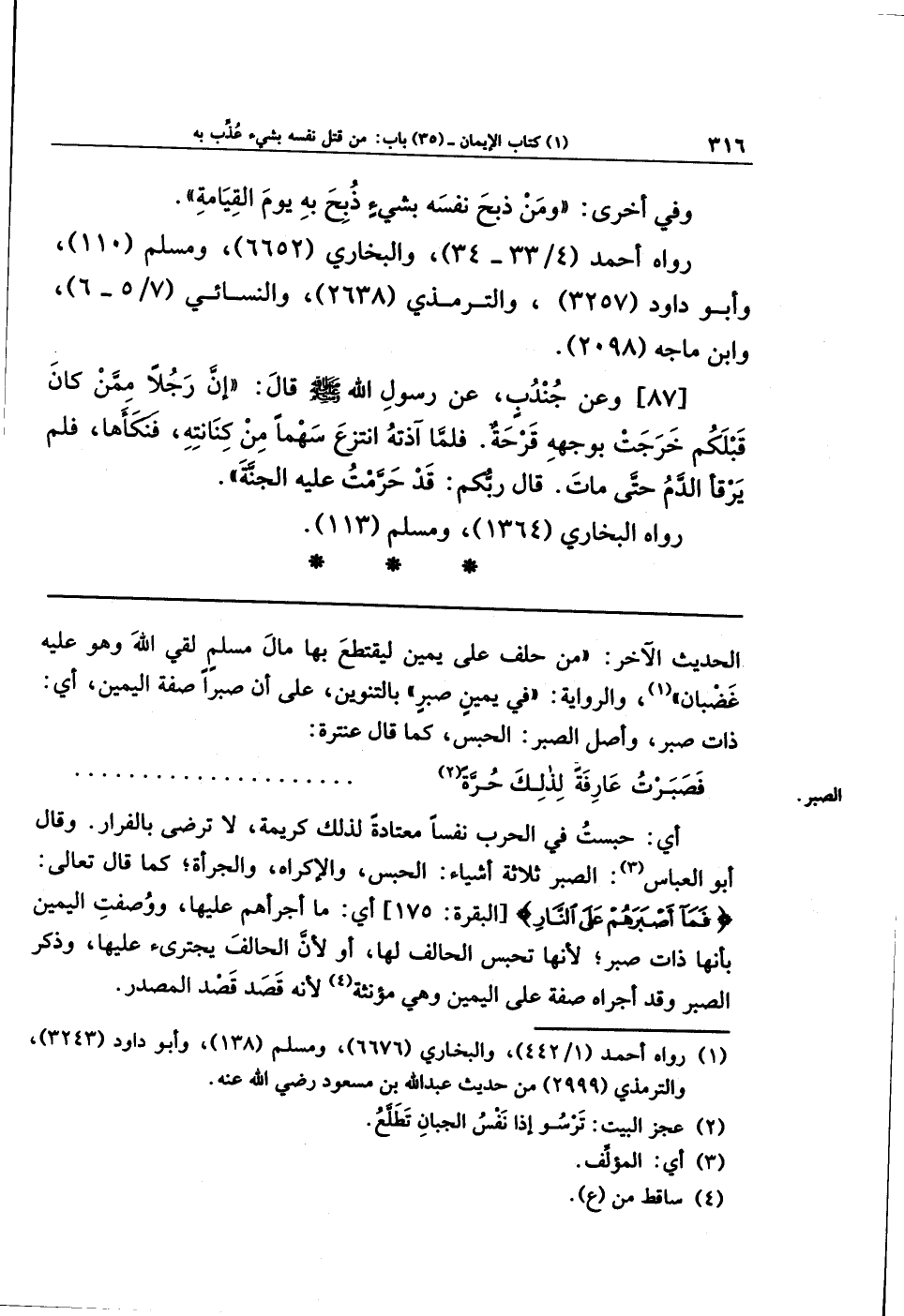 [87] وَعَن جُندَبٍ، عَن رَسُولِ اللهِ - صلى الله عليه وسلم - قَالَ: إِنَّ رَجُلاً مِمَّن كَانَ قَبلَكُم خَرَجَت بِوَجهِهِ قُرحَةٌ، فَلَمَّا آذَتهُ، انتَزَعَ سَهمًا مِن كِنَانَتِهِ، فَنَكَأَهَا، فَلَم يَرقَأِ الدَّمُ حَتَّى مَاتَ، قَالَ رَبُّكُم: قَد حَرَّمتُ عَلَيهِ الجَنَّةَ.