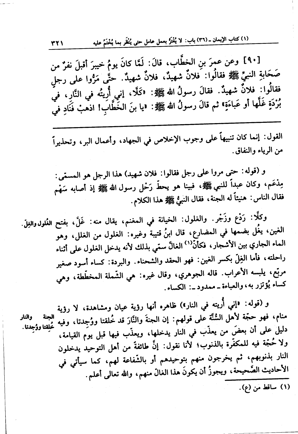 [90] وَعَن عُمَرَ بنِ الخَطَّابِ، قَالَ: لَمَّا كَانَ يَومُ خَيبَرَ، أَقبَلَ نَفَرٌ مِن صَحَابَةِ النَّبِيِّ - صلى الله عليه وسلم -، فَقَالُوا: فُلاَنٌ شَهِيدٌ، فُلاَنٌ شَهِيدٌ، حَتَّى مَرُّوا عَلَى رَجُلٍ، فَقَالُوا: فُلاَنٌ شَهِيدٌ، فَقَالَ رَسُولُ اللهِ - صلى الله عليه وسلم -: كَلاَّ! إِنِّي رَأَيتُهُ فِي النَّارِ، فِي بُردَةٍ غَلَّهَا، أو عَبَاءَةٍ، ثُمَّ قَالَ رَسُولُ اللهِ - صلى الله عليه وسلم -: يَا ابنَ الخَطَّابِ، اذهَب فَنَادِ فِي