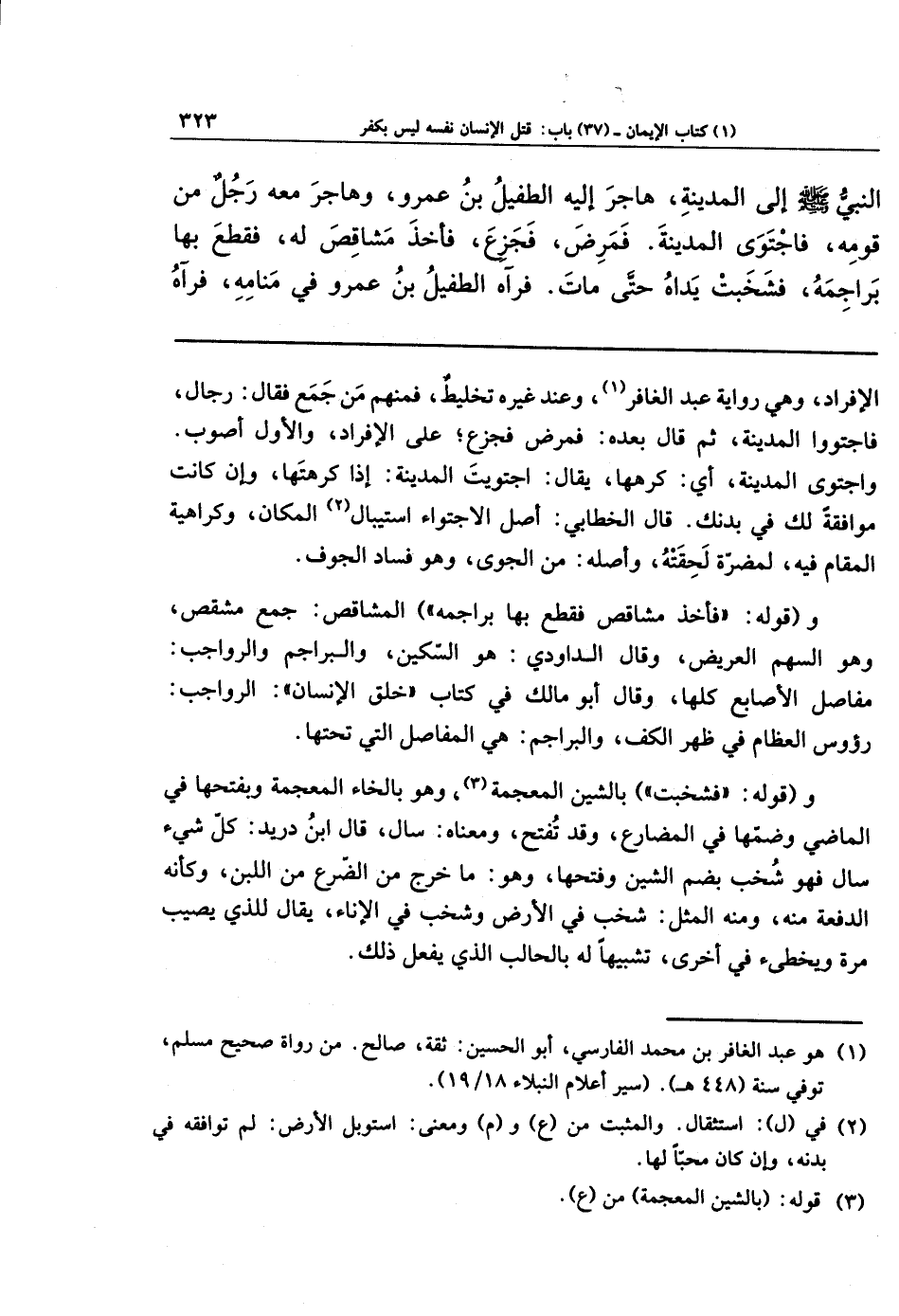 النَّبِيُّ - صلى الله عليه وسلم - إِلَى المَدِينَةِ، هَاجَرَ إِلَيهِ الطُّفَيلُ بنُ عمرو، وَهَاجَرَ مَعَهُ رجلٌ مِن قَومِهِ، فَاجتَوَى المَدِينَةَ، فَمَرِضَ، فَجَزِعَ، فَأَخَذَ مَشَاقِصَ لَهُ، فَقَطَعَ بِهَا بَرَاجِمَهُ، فَشَخَبَت يَدَاهُ حَتَّى مَاتَ، فَرَآهُ الطُّفَيلُ بنُ عمرو فِي مَنَامِهِ، فَرَآهُ