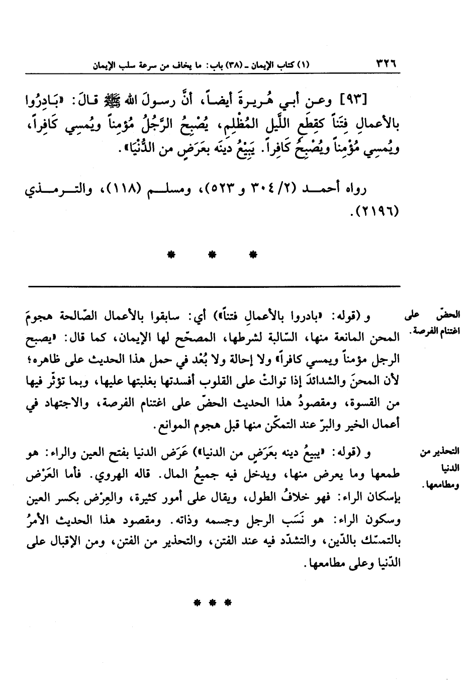 [93] وعَن أَبِي هُرَيرَةَ أَيضًا؛ أَنَّ رسولَ الله - صلى الله عليه وسلم - قَالَ: بَادِرُوا بِالأَعمَالِ فِتَنًا كَقِطَعِ اللَّيلِ المُظلِمِ، يُصبِحُ الرَّجُلُ مُؤمِنًا، وَيُمسِي كَافِرًا، ويُمسِي مُؤمِنًا، وَيُصبِحُ كَافِرًا. يَبِيعُ دِينَهُ بِعَرَضٍ مِنَ الدُّنيَا.