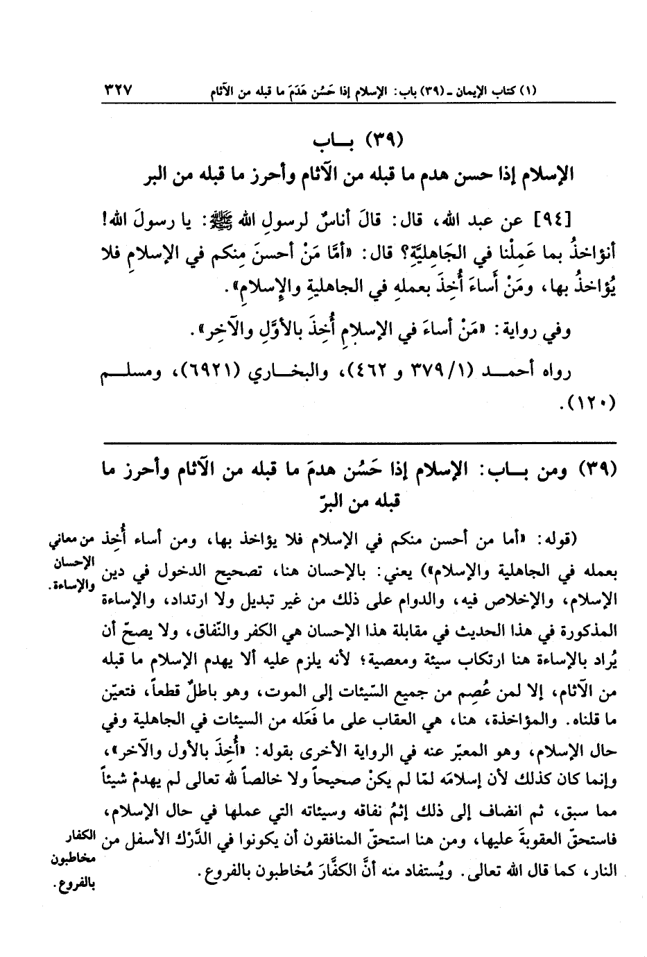 (39) وَمِن بَابٍ الإِسلاَمُ إِذَا حَسُنَ، هَدَمَ مَا قَبلَهُ مِنَ الآثَامِ، وَأَحرَزَ مَا قَبلَهُ مِنَ البِرِّ