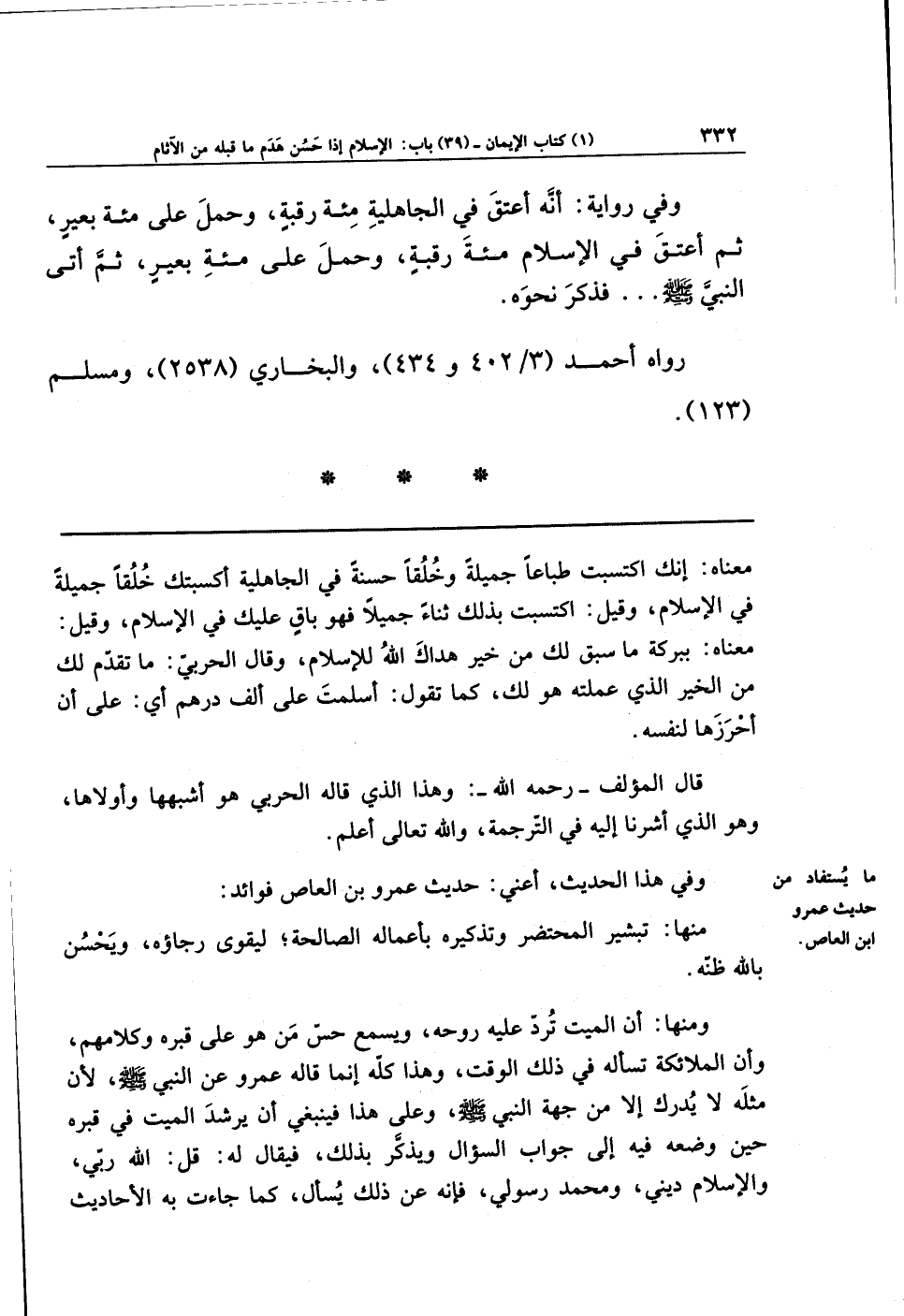 وَفِي رِوَايَةٍ: أَنَّهُ أَعتَقَ فِي الجَاهِلِيَّةِ مِائَةَ رَقَبَةٍ، وَحَمَلَ عَلَى مِائَةِ بَعِيرٍ، ثُمَّ أَعتَقَ فِي الإِسلاَمِ مِائَةَ رَقَبَةٍ، وَحَمَلَ عَلَى مِائَةِ بَعِيرٍ، ثُمَّ أَتَى النَّبِيَّ - صلى الله عليه وسلم -. . . فَذَكَرَ نَحوَهُ.
