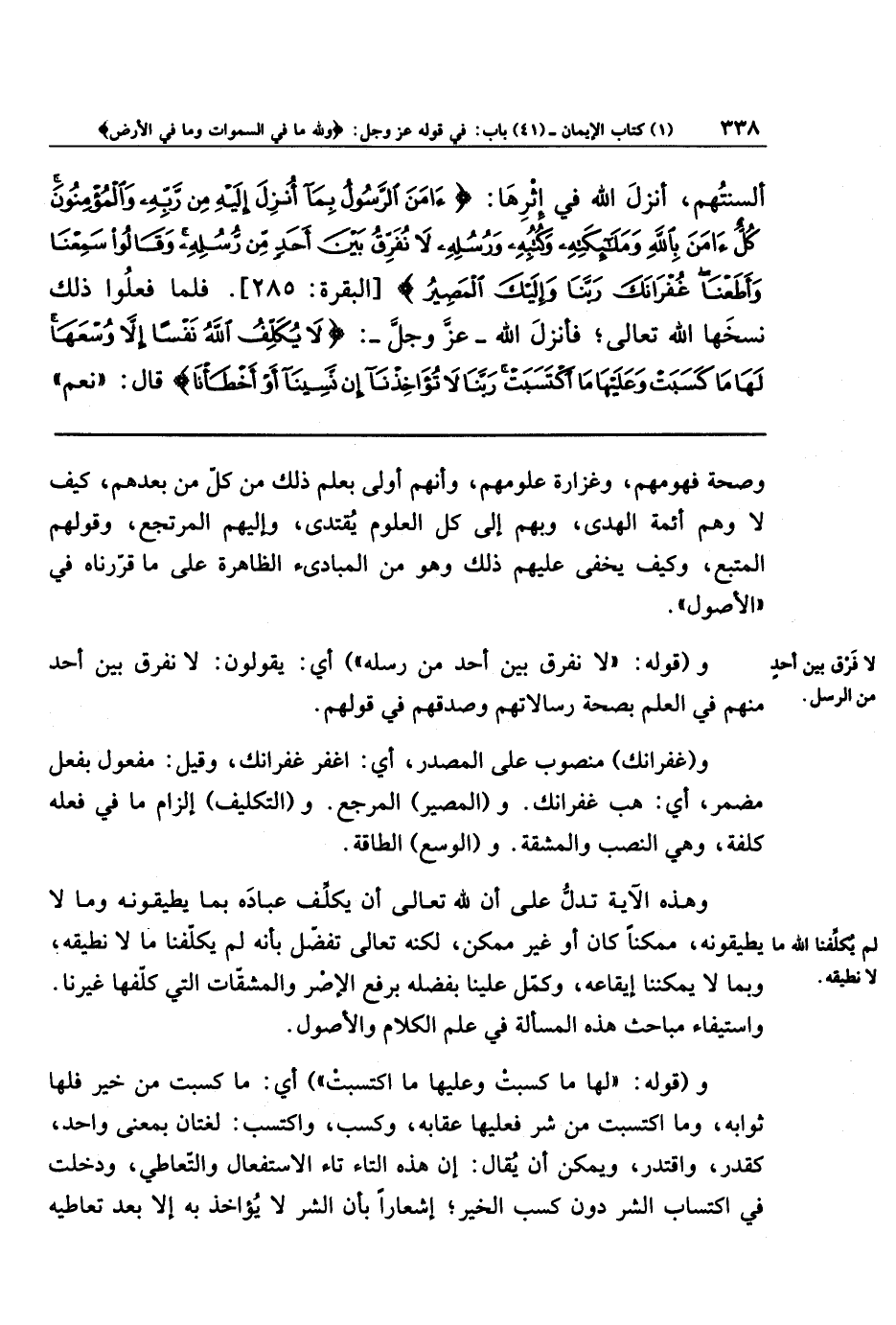 أَلسِنَتُهُم، أَنزَلَ اللهُ فِي إِثرِهَا: آمَنَ الرَّسُولُ بِمَا أُنزِلَ إِلَيهِ مِن رَبِّهِ وَالمُؤمِنُونَ كُلٌّ آمَنَ بِاللَّهِ وَمَلَائِكَتِهِ وَكُتُبِهِ وَرُسُلِهِ لَا نُفَرِّقُ بَينَ أَحَدٍ مِن رُسُلِهِ وَقَالُوا سَمِعنَا وَأَطَعنَا غُفرَانَكَ رَبَّنَا وَإِلَيكَ المَصِيرُ فَلَمَّا فَعَلُوا ذَلِكَ، نَسَخَهَا اللهُ تَعَالَى؛ فَأَنزَلَ اللهُ عز وجل: لَا يُكَلِّفُ اللَّهُ نَفسًا إِلَّا وُسعَهَا لَهَا مَا كَسَبَت وَعَلَيهَا مَا اكتَسَبَت رَبَّنَا لَا تُؤَاخِذنَا إِن نَسِينَا أَو أَخطَأنَا قَالَ: نَعَم،