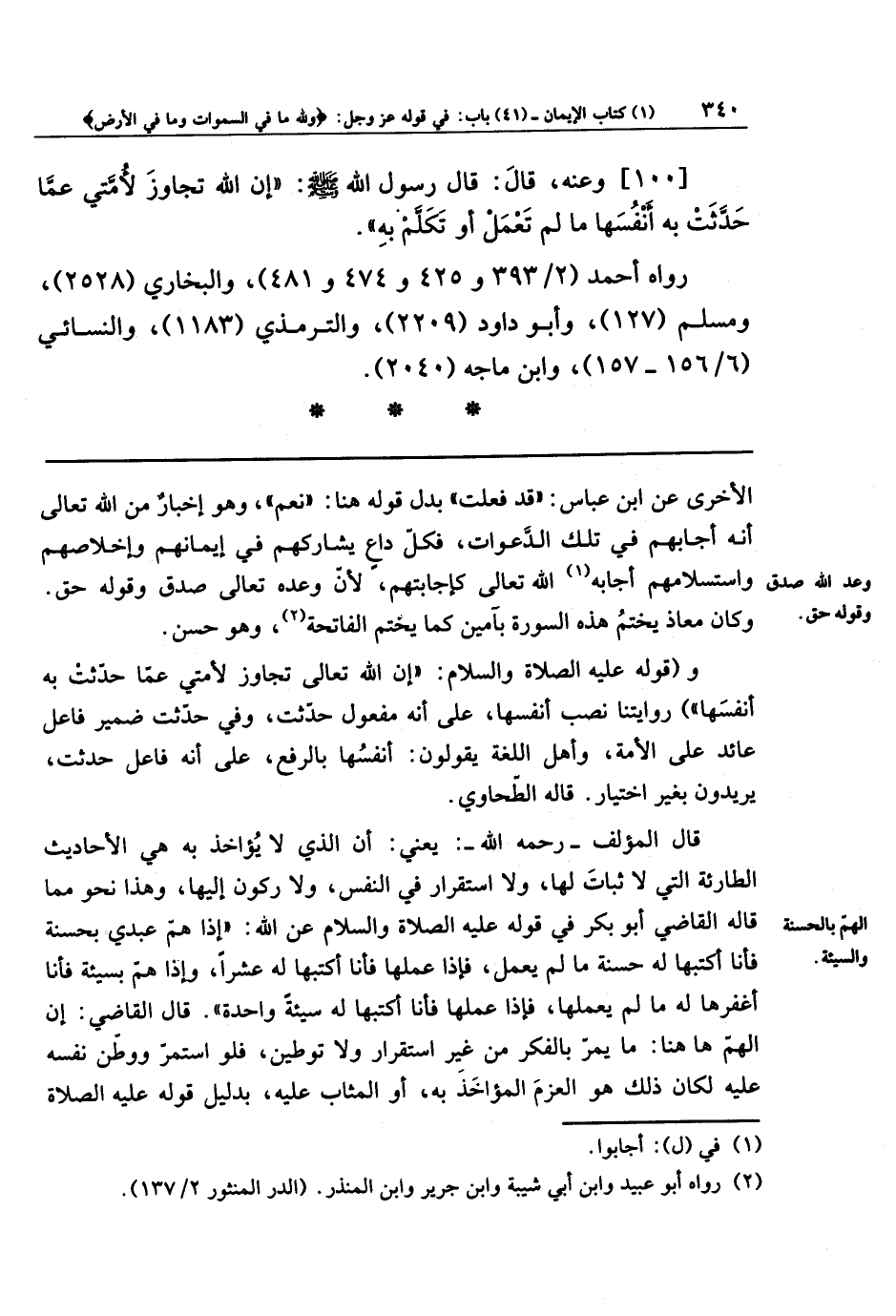 [100] وعَنهُ، قَالَ: قَالَ رَسُولُ اللهِ - صلى الله عليه وسلم -: إِنَّ اللهَ تَجَاوَزَ لِأُمَّتِي عَمَّا حَدَّثَت بِهِ أَنفُسَهَا مَا لَم تَعمَل أو تَكَلَّم بِهِ.