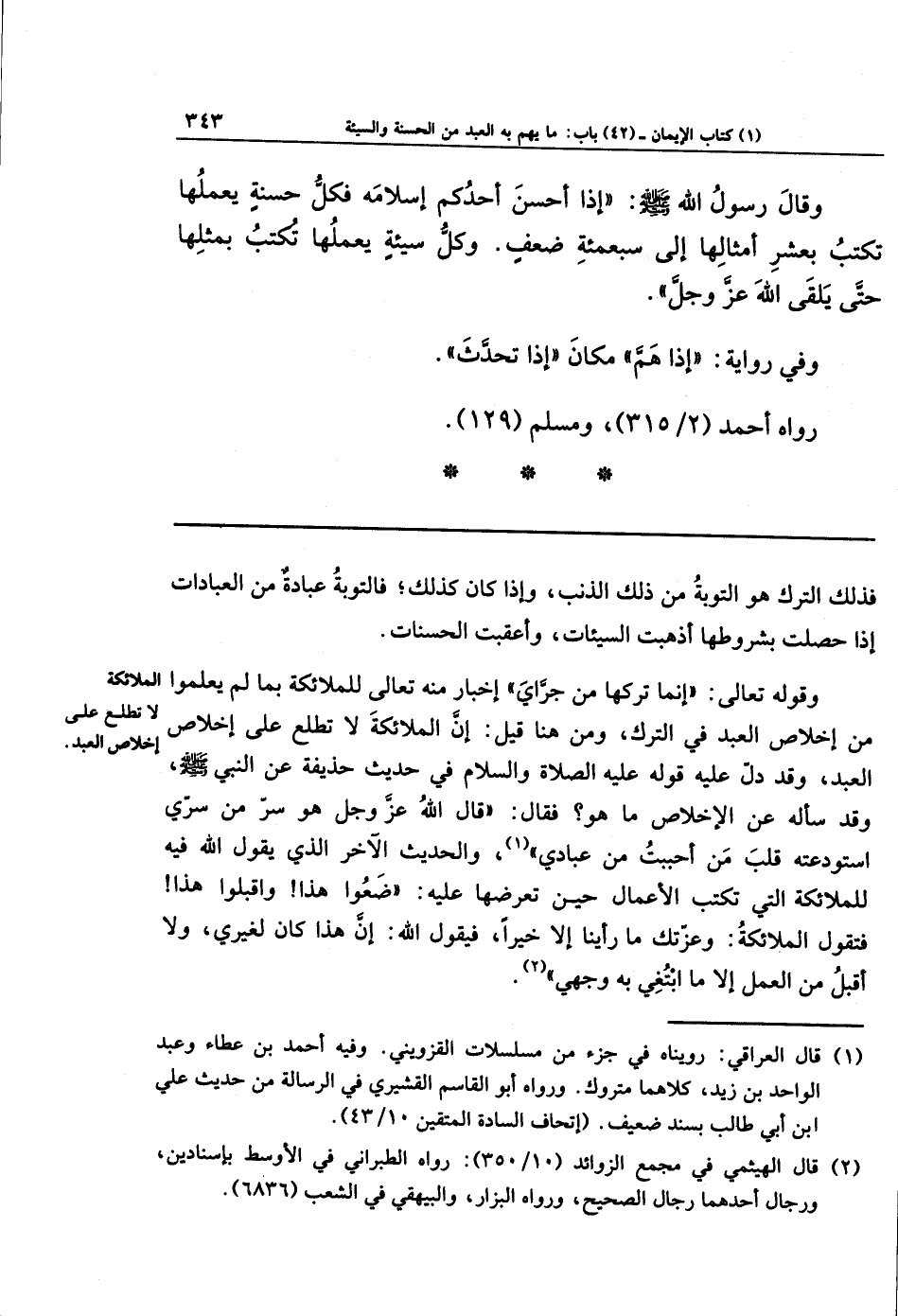 وَقَالَ رَسُولُ اللهِ - صلى الله عليه وسلم -: إِذَا أَحسَنَ أَحَدُكُم إِسلاَمَهُ، فَكُلُّ حَسَنَةٍ يَعمَلُهَا تُكتَبُ بِعَشرِ أَمثَالِهَا إِلَى سَبعِمِائَةِ ضِعفٍ، وَكُلُّ سَيِّئَةٍ يَعمَلُهَا تُكتَبُ بِمِثلِهَا حَتَّى يَلقَى اللهَ عَزَّ وَجَلَّ.