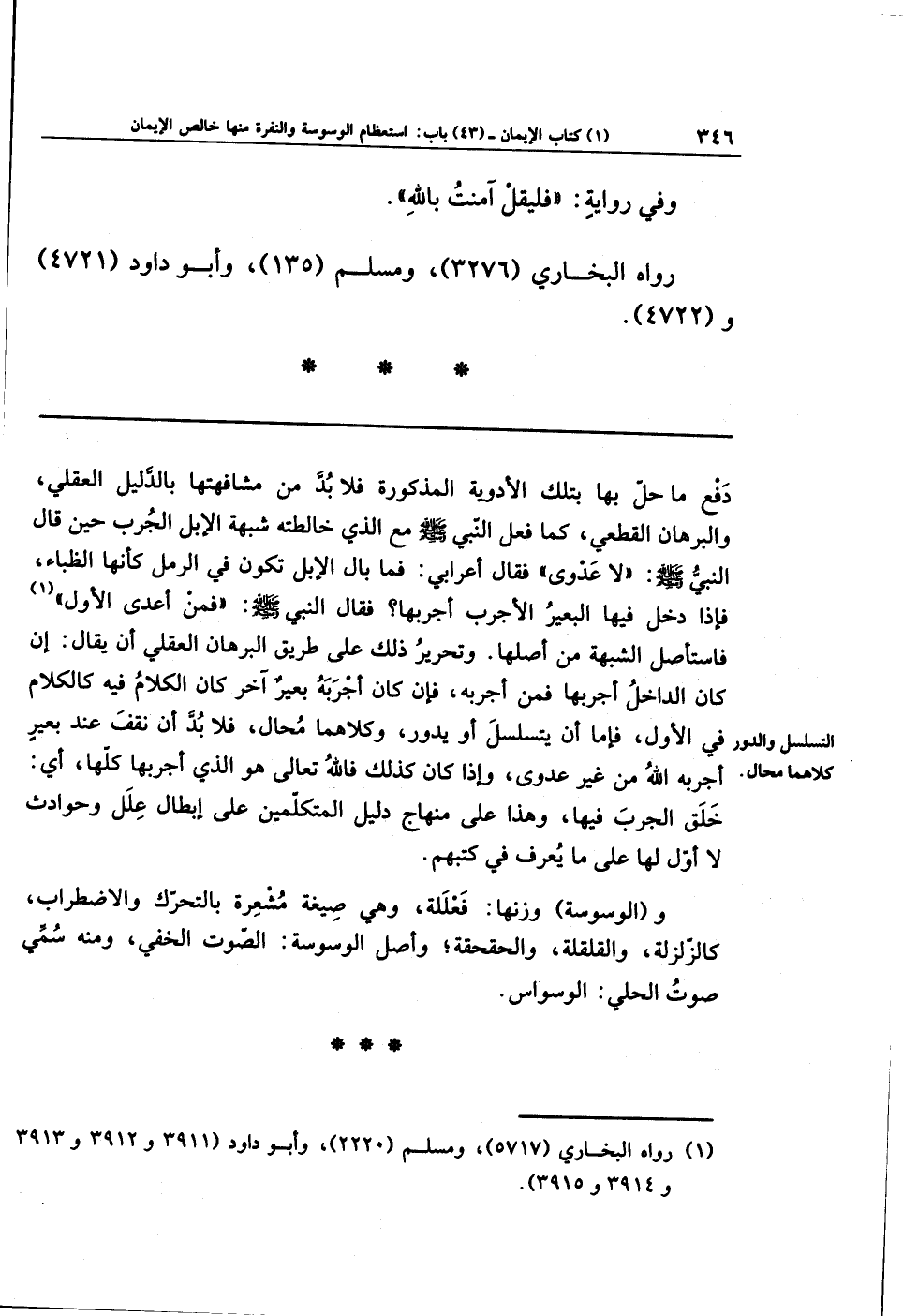 وتحريرُ ذلك على طريقِ البرهانِ العقليِّ أن يقال: إن كان الداخلُ أجرَبَهَا، فمن أجرَبَهُ؛ فإن كان أجرَبَهُ بعيرٌ آخر كان الكلامُ فيه كالكلامِ في الأوَّل، فإمَّا أن يتسلسَلَ أو يَدُور، وكلاهما محال، فلا بُدَّ أن نقف عند بَعِيرٍ أجربَهُ الله مِن غير عَدوَى؛ وإذا كان كذلك، فاللهُ تعالى هو الذي أجرَبَهَا كلَّها، أي: خلَقَ الجَرَبَ فيها. وهذا على منهاجِ دليلِ المتكلِّمين على إبطالِ عِلَلٍ وحوادثَ لا أَوَّلَ لها على ما يُعرَفُ في كتبهم.