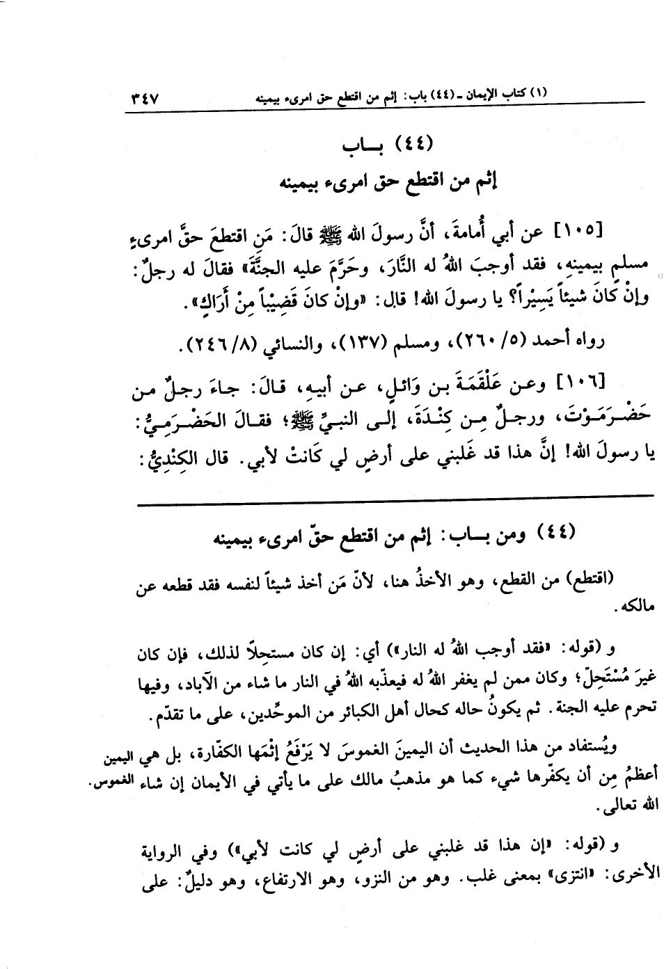 (44) وَمِن بَابِ إِثمِ مَنِ اقتَطَعَ حَقَّ امرِئٍ بِيَمِينِهِ