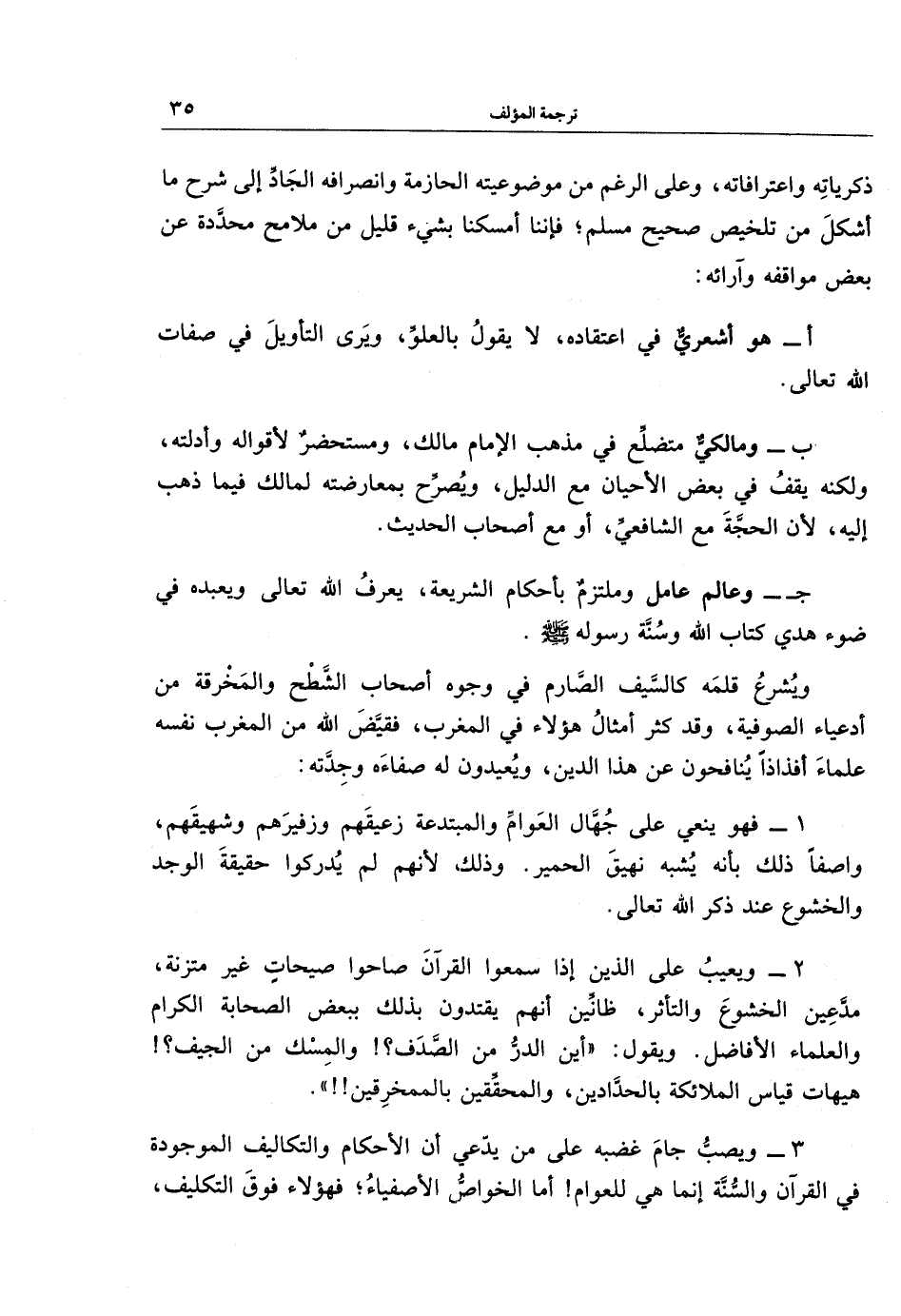 ذكرياتِه واعترافاته، وعلى الرغم من موضوعيته الحازمة وانصرافه الجَادِّ إلى شرح ما أشكلَ من تلخيص صحيح مسلم؛ فإننا أمسكنا بشيء قليل من ملامح محدَّدة عن بعض مواقفه وآرائه: