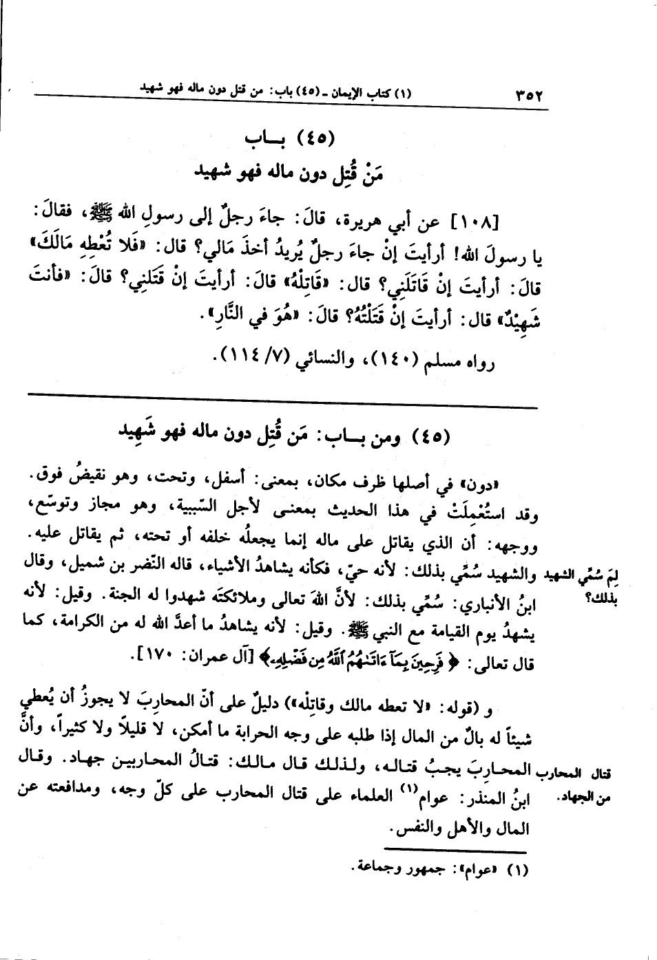 (45) وَمِن بَابِ مَن قُتِلَ دُونَ مَالِهِ، فهو شَهِيدٌ.