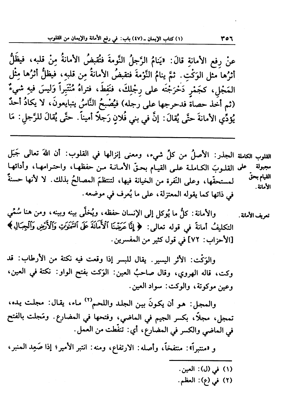 عَن رَفعِ الأَمَانَةِ، قَالَ: يَنَامُ الرَّجُلُ النَّومَةَ فَتُقبَضُ الأَمَانَةُ مِن قَلبِهِ، فَيَظَلُّ أَثَرُهَا مِثلَ الوَكتِ، ثُمَّ يَنَامُ النَّومَةَ فَتُقبَضُ الأَمَانَةُ مِن قَلبِهِ، فَيَظَلُّ أَثَرُهَا مِثلَ المَجلِ، كَجَمرٍ دَحرَجتَهُ عَلَى رِجلِكَ، فَنَفِطَ، فَتَرَاهُ مُنتَبِرًا وَلَيسَ فِيهِ شَيءٌ، ثُمَّ أَخَذَ حَصَاةً فَدَحرَجَها عَلَى رِجلِهِ، فَيُصبِحُ النَّاسُ يَتَبَايَعُونَ، لاَ يَكَادُ أَحَدٌ يُؤَدِّي الأَمَانَةَ، حَتَّى يُقَالَ: إِنَّ فِي بَنِي فُلاَنٍ رَجُلاً أَمِينًا، حَتَّى يُقَالَ لِلرَّجُلِ: مَا