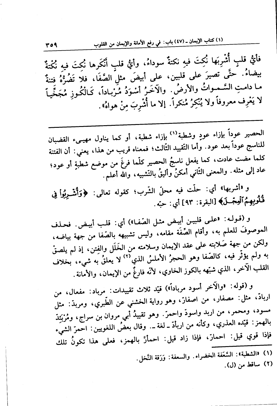 فَأَيُّ قَلبٍ أُشرِبَهَا، نُكِتَ فِيهِ نُكتَةٌ سَودَاءُ، وَأَيُّ قَلبٍ أَنكَرَهَا، نُكِتَ فِيهِ نُكتَةٌ بَيضَاءُ، حَتَّى تَصِيرَ عَلَى قَلبَينِ: عَلَى أَبيَضَ مِثلِ الصَّفَا، فَلاَ تَضُرُّهُ فِتنَةٌ مَا دَامَتِ السَّمَاوَاتُ وَالأَرضُ، وَالآخَرُ أَسوَدُ مُربَادا كَالكُوزِ مُجَخِّيًا؛ لاَ يَعرِفُ مَعرُوفًا، وَلا يُنكِرُ مُنكَرًا، إِلاَّ مَا أُشرِبَ مِن هَوَاهُ.