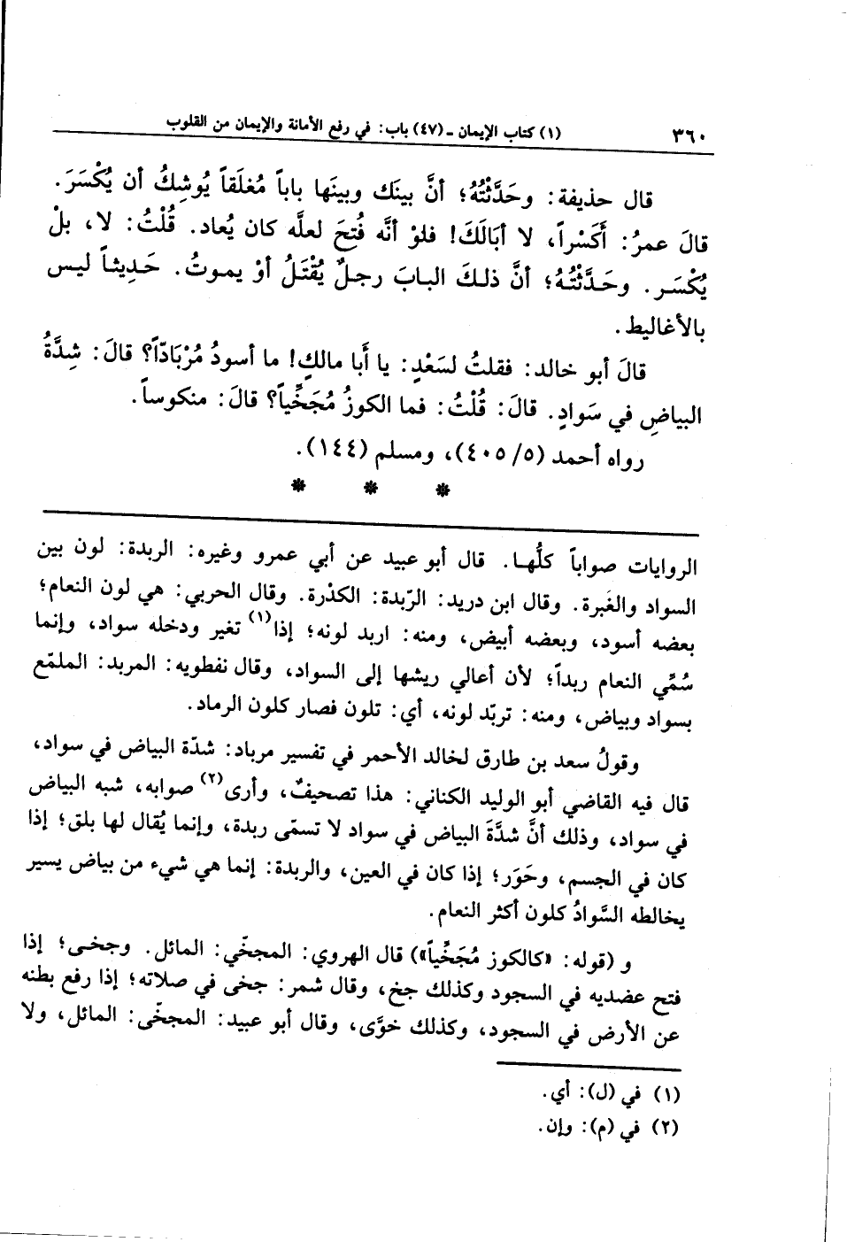 قَالَ أبو خَالِدٍ: فَقُلتُ لِسَعدٍ: يَا أَبَا مَالِكٍ، مَا أَسوَدُ مُربَادا؟ قَالَ: شِدَّةُ البَيَاضِ فِي سَوَادٍ، قَالَ: قُلتُ: فَمَا الكُوزُ مُجَخِّيًا؟ قَالَ: مَنكُوسًا.