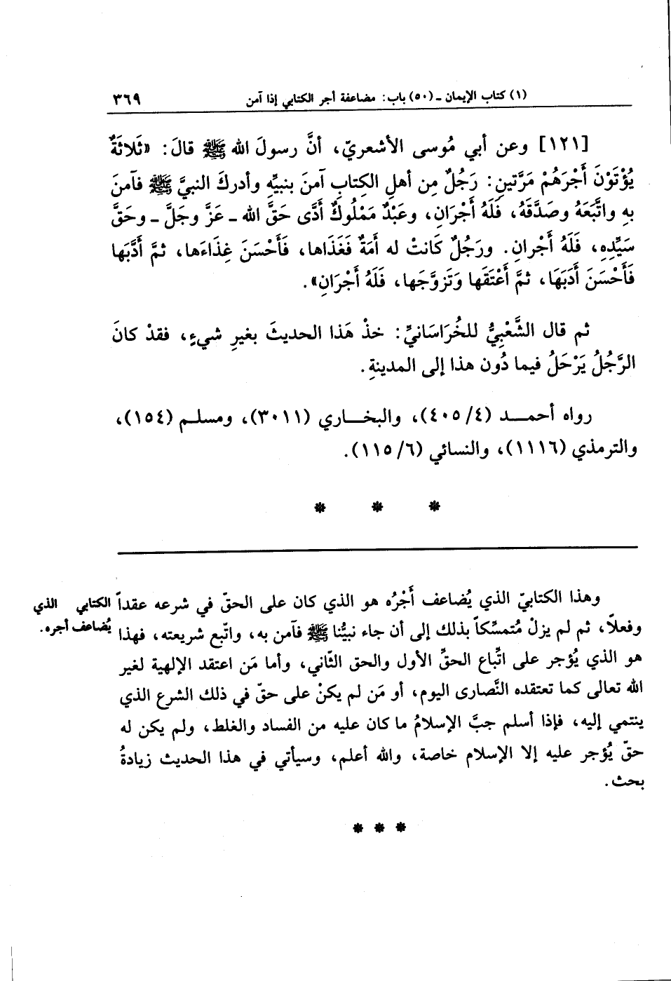 [121] وعَن أَبِي مُوسَى الأشعَرِي؛ أَنَّ رسولَ الله - صلى الله عليه وسلم - قَالَ: ثَلاثَةٌ يُؤتَونَ أَجرَهُم مَرَّتَينِ: رَجُلٌ مِن أهل الكِتَابِ آمَنَ بِنَبِيِّهِ، وَأَدرَكَ النَّبِيَّ - صلى الله عليه وسلم - فَآمَنَ بِهِ وَاتَّبَعَهُ وَصَدَّقَهُ، فَلَهُ أَجرَانِ. وَعَبدٌ مَملُوكٌ أَدَّى حَقَّ اللهِ عَزَّ وَجَلَّ وَحَقَّ سَيِّدِهِ، فَلَهُ أَجرَانِ. وَرَجُلٌ كَانَت لَهُ أَمَةٌ فَغَذَّاهَا فَأَحسَنَ غِذَاءَهَا، ثُمَّ أَدَّبَهَا فَأَحسَنَ أَدَبَهَا، ثُمَّ أَعتَقَهَا وَتَزَوَّجَهَا، فَلَهُ أَجرَانِ.