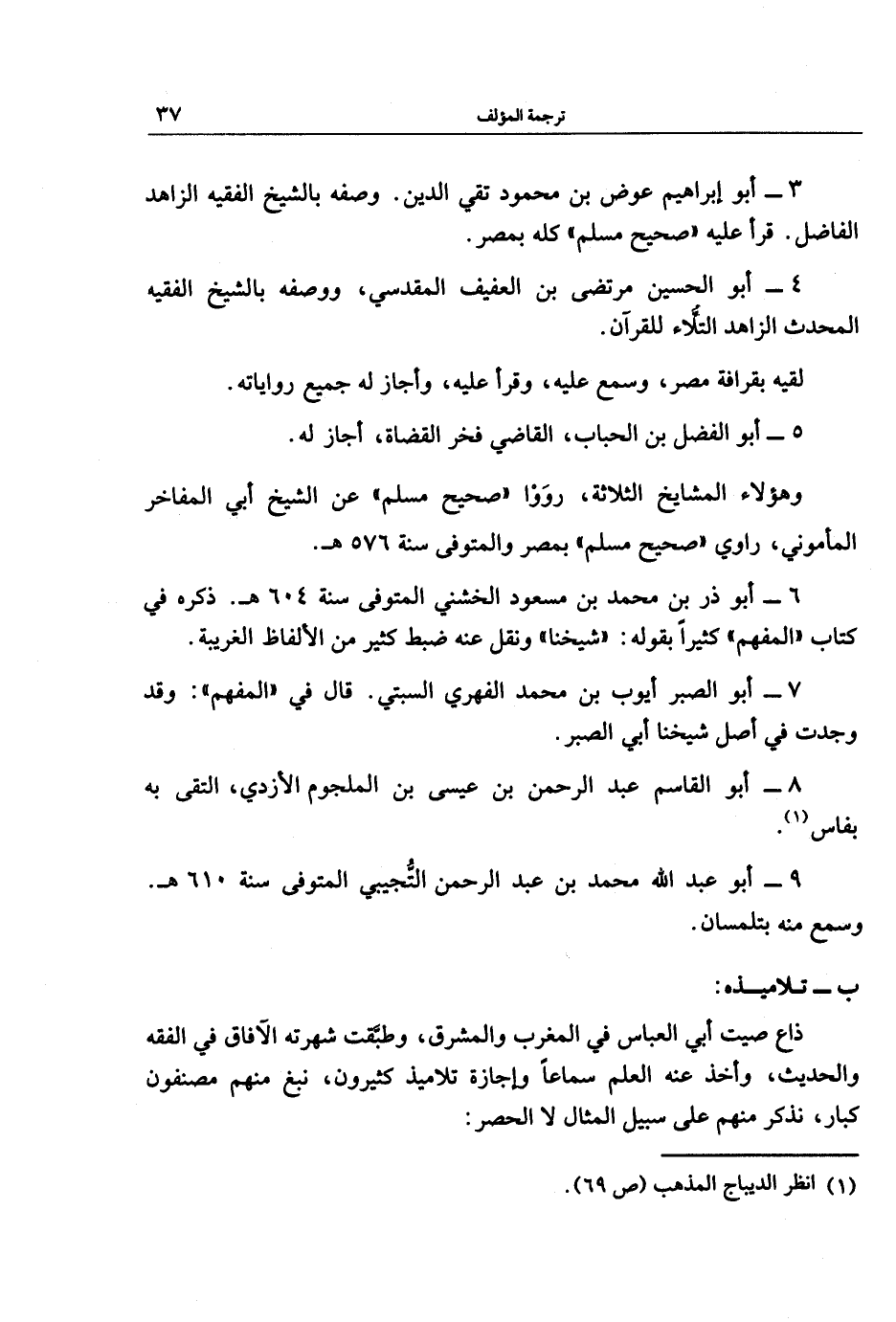 6 - أبو ذر بن محمد بن مسعود الخشني المتوفى سنة 604 هـ. ذكره في كتاب "المفهم" كثيرًا بقوله: "شيخنا" ونقل عنه ضبط كثير من الألفاظ الغريبة.